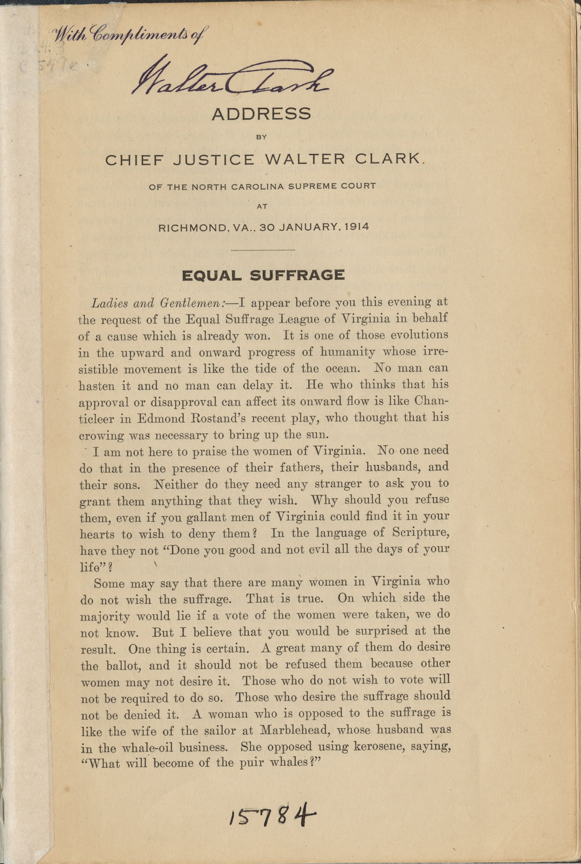 EQUAL SUFFRAGELadies and Gentlemen:—I appear before you this evening at the request of the Equal Suffrage League of Virginia in behalf of a cause which is already won. It is one of those evolutions in the upward and onward progress of humanity whose irresistible movement is like the tide of the ocean. No man can hasten it and no man can delay it. He who thinks that his approval or disapproval can affect its onward flow is like Chanticleer in Edmond Rostand's recent play, who thought that his crowing was necessary to bring up the sun.