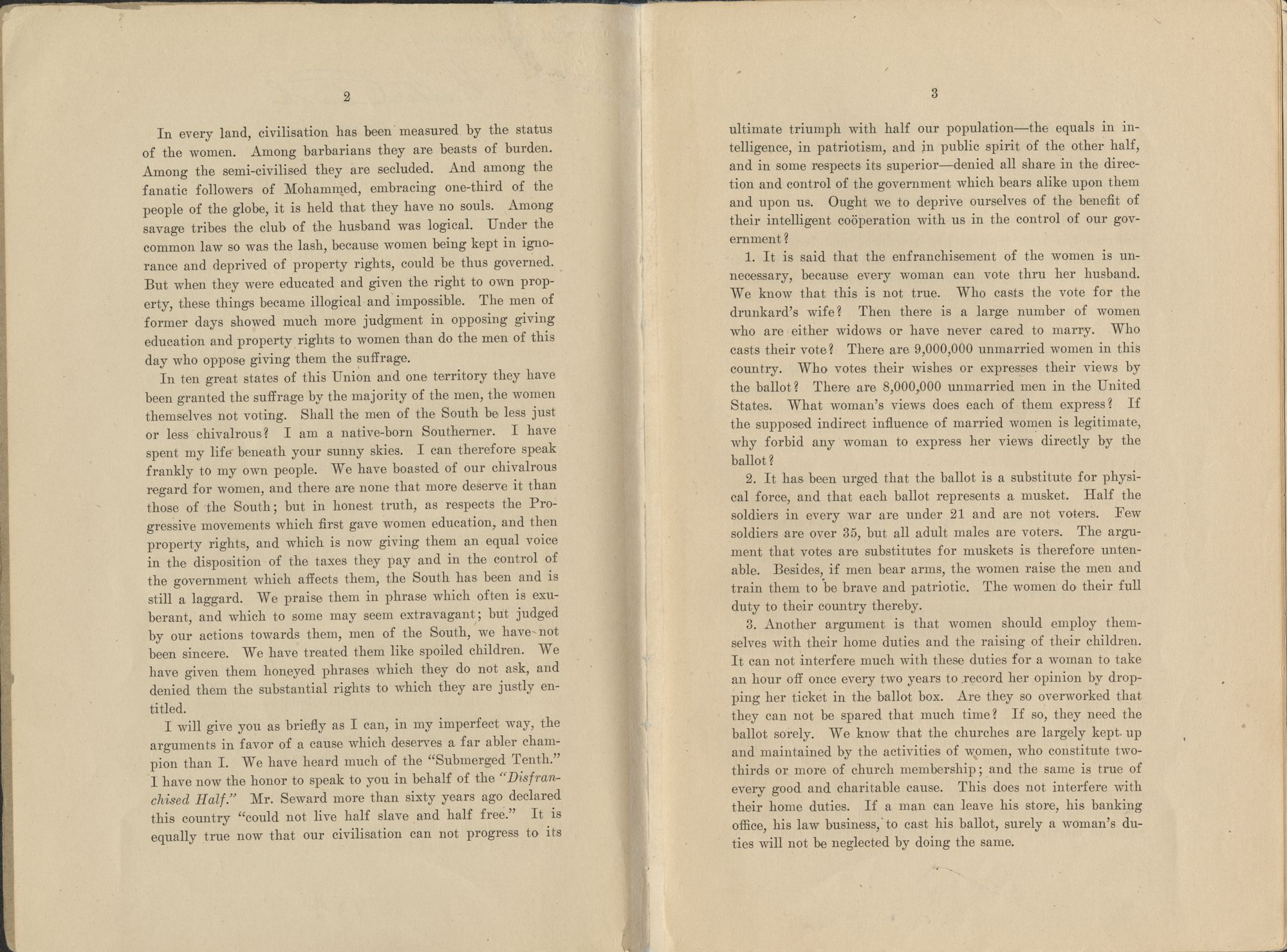 I will give you as briefly as I can, in my imperfect way, the arguments in favor of a cause which deserves a far abler champion than I. We have heard much of the "Submerged Tenth." I have now the honor to speak to you in behalf of the "Disfranchised Half." Mr. Seward more than sixty years ago declared this country "could not live half slave and half free." It is equally true now that our civilisation can not progress to its