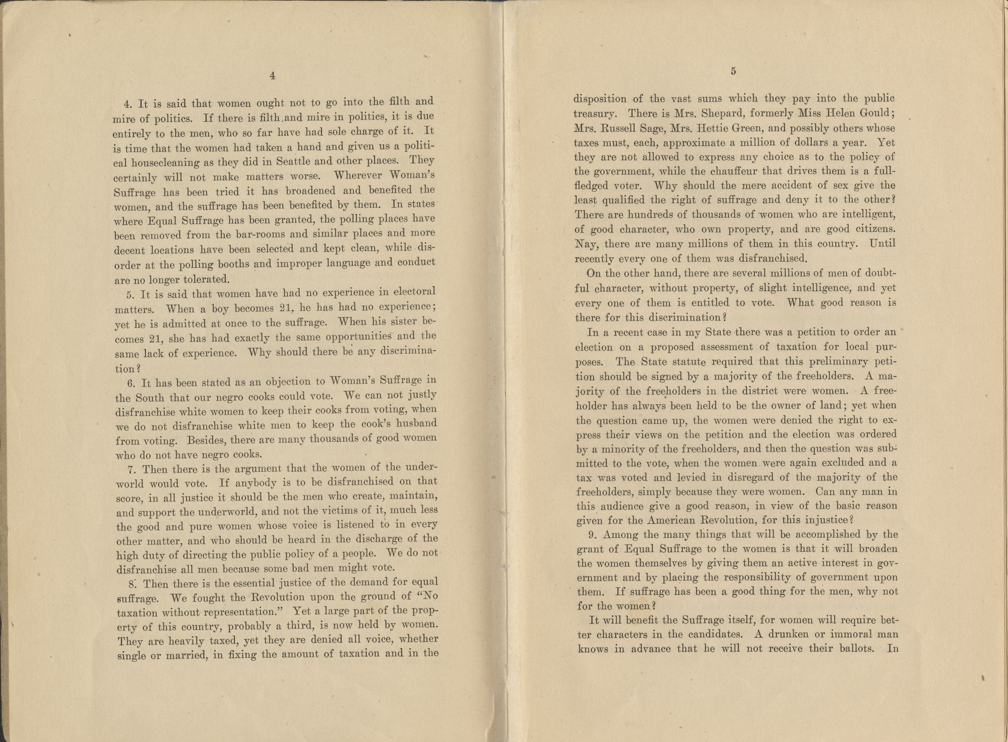 disposition of the vast sums which they pay into the public treasury. There is Mrs. Shepard, formerly Miss Helen Gould; Mrs. Russell Sage, Mrs. Hettie Green, and possibly others whose taxes must, each, approximate a million of dollars a year. Yet they are not allowed to express any choice as to the policy of the government, while the chauffeur that drives them is a full-fledged voter. Why should the mere accident of sex give the least qualified the right of suffrage and deny it to the other? There are hundreds of thousands of women who are intelligent, of good character, who own property, and are good citizens. Nay, there are many millions of them in this country. Until recently every one of them was disfranchised.