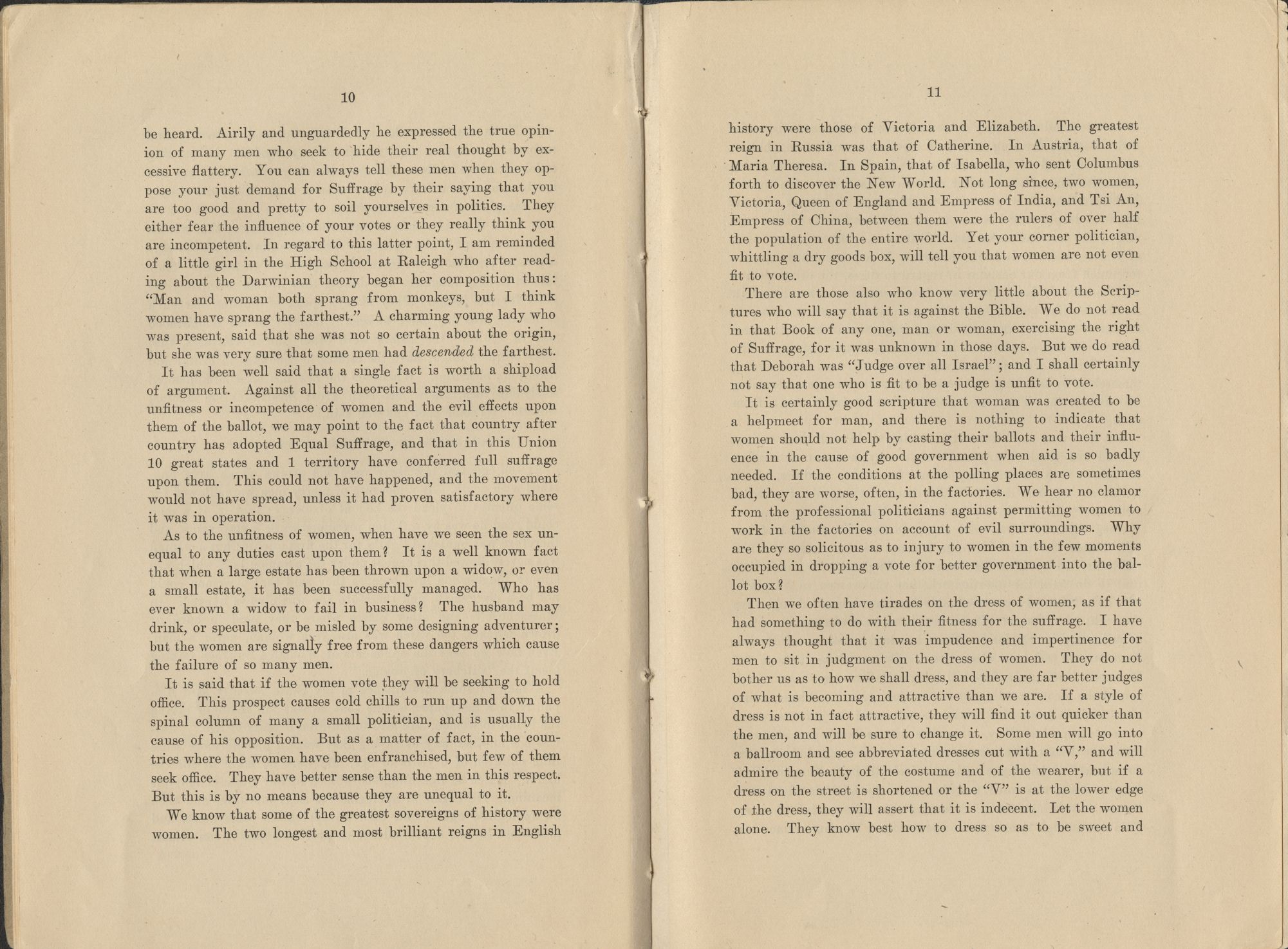 be heard. Airily and unguardedly he expressed the true opinion of many men who seek to hide their real thought by excessive flattery. You can always tell these men when they op-pose your just demand for Suffrage by their saying that you are too good and pretty to soil yourselves in politics. They either fear the influence of your votes or they really think you are incompetent. In regard to this latter point, I am reminded of a little girl in the High School at Raleigh who after reading about the Darwinian theory began her composition thus: "Man and woman both sprang from monkeys, but I think women have sprang the farthest." A charming young lady who was present, said that she was not so certain about the origin, but she was very sure that some men had descended the farthest.