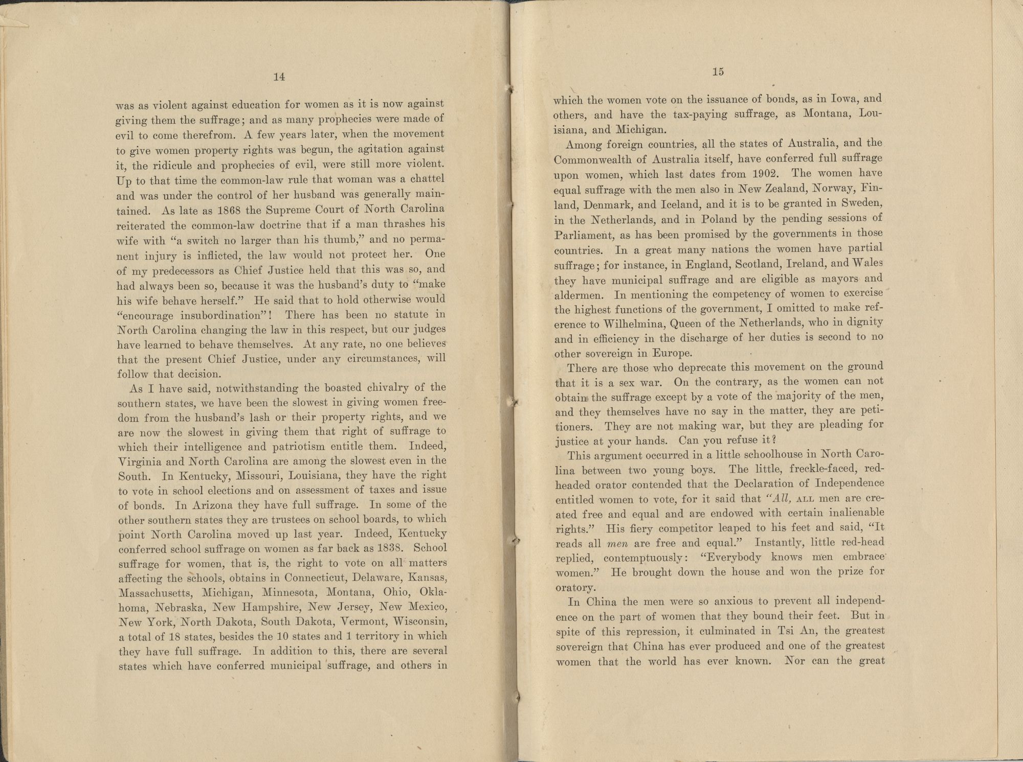 As I have said, notwithstanding the boasted chivalry of the southern states, we have been the slowest in giving women freedom from the husband's lash or their property rights, and we are now the slowest in giving them that right of suffrage to which their intelligence and patriotism entitle them. Indeed, Virginia and North Carolina are among the slowest even in the South. In Kentucky, Missouri, Louisiana, they have the right to vote in school elections and on assessment of taxes and issue of bonds. In Arizona they have full suffrage. In some of the other southern states they are trustees on school boards, to which point North Carolina moved up last year. Indeed, Kentucky conferred school suffrage on women as far back as 1838. School suffrage for women, that is, the right to vote on all matters affecting the schools, obtains in Connecticut, Delaware, Kansas, Massachusetts, Michigan, Minnesota, Montana, Ohio, Oklahoma, Nebraska, New Hampshire, New Jersey, New Mexico, New York, North Dakota, South Dakota, Vermont, Wisconsin, a total of 18 states, besides the 10 states and 1 territory in which they have full suffrage. In addition to this, there are several states which have conferred municipal suffrage, and others in