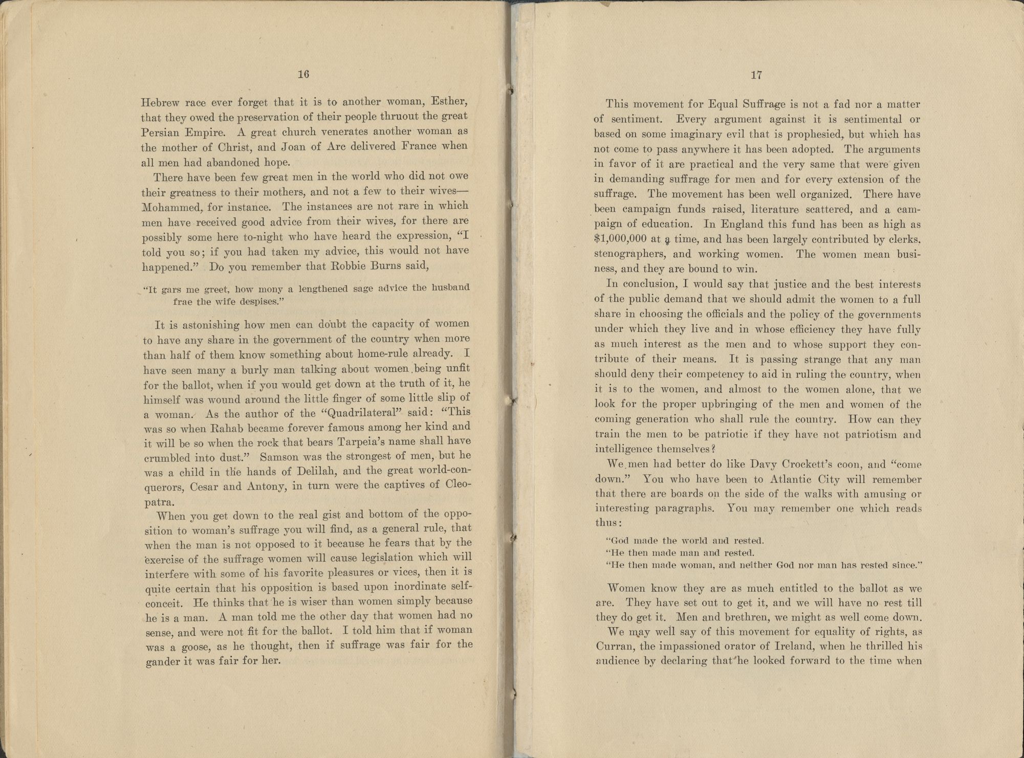 It is astonishing how men can doubt the capacity of women to have any share in the government of the country when more than half of them know something about home-rule already. I have seen many a burly man talking about women being unfit for the ballot, when if you would get down at the truth of it, he himself was wound around the little finger of some little slip of a woman. As the author of the "Quadrilateral" said: "This was so when Rahab became forever famous among her kind and it will be so when the rock that bears Tarpeia's name shall have crumbled into dust." Samson was the strongest of men, but he was a child in the hands of Delilah, and the great world-conquerors, Cesar and Antony, in turn were the captives of Cleopatra.