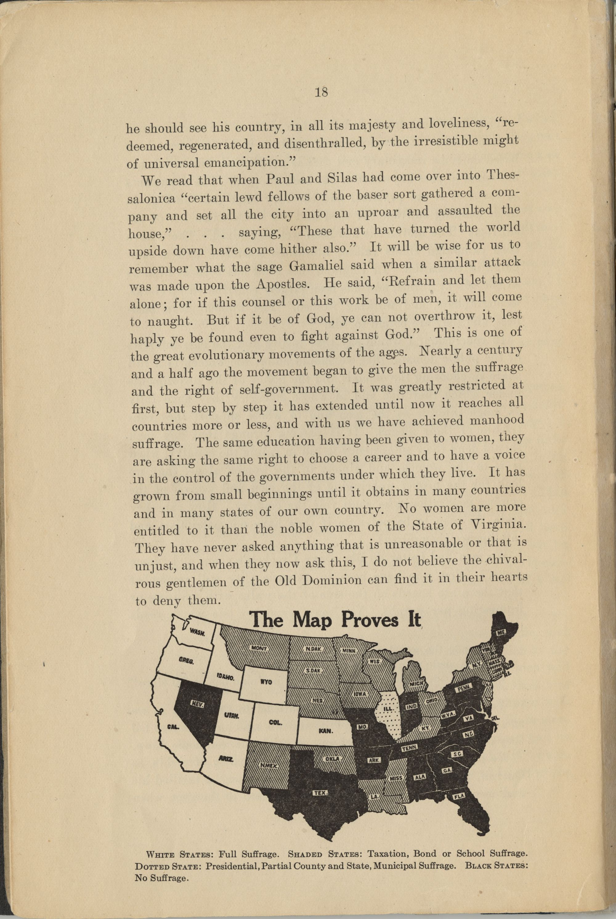 We read that when Paul and Silas had come over into Thessalonica "certain lewd fellows of the baser sort gathered a company and set all the city into an uproar and assaulted the house," . . . saying, "These that have turned the world upside down have come hither also." It will be wise for us to remember what the sage Gamaliel said when a similar attack was made upon the Apostles. He said, "Refrain and let them alone; for if this counsel or this work be of men, it will come to naught. But if it be of God, ye can not overthrow it, lest haply ye be found even to fight against God." This is one of the great evolutionary movements of the ages. Nearly a century and a half ago the movement began to give the men the suffrage and the right of self-government. It was greatly restricted at first, but step by step it has extended until now it reaches all countries more or less, and with us we have achieved manhood suffrage. The same education having been given to women, they are asking the same right to choose a career and to have a voice in the control of the governments under which they live. It has grown from small beginnings until it obtains in many countries and in many states of our own country. No women are more entitled to it, than the noble women of the State of Virginia. They have never asked anything that is unreasonable or that is unjust, and when they now ask this, I do not believe the chivalrous gentlemen of the Old Dominion can find it in their hearts to deny them.