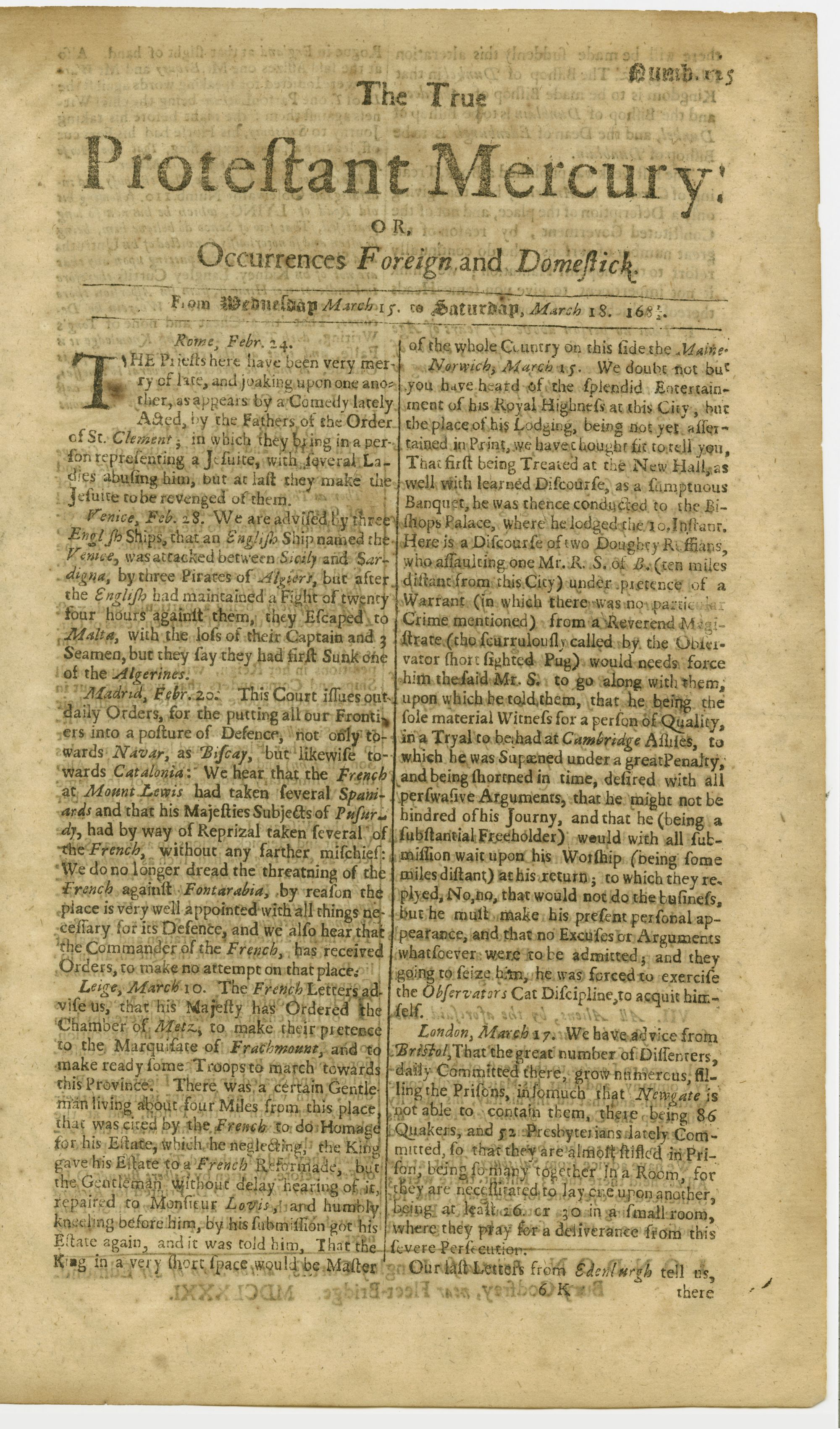 Norwich, March 15. We doubt not but you have heard of the splendid Entertainment of his Royal Highness at this City, but the place of his Lodging, being not yet assertained in Print, we have thought fit to tell you, That first being Treated at the New Hall, as well with learned Discourse, as a sumptuous Banquet, he was thence conducted to the Bishops Palace, where he lodged the 10 Instant. Here is a Discourse of two Doughty Ruffians, who assaulting one Mr. R.S. of B. (ten miles distant from this City) under pretence of a Warrant (in which there was no particular Crime mentioned) from a Reverent Magistrate (tho surrulously called by the Observator short sighted Pug) would needs force him the said Mr. S. to go along with them, upon which he told them, that he being the sole material Witness for a person of Quality, in a Tryal to be had at Cumbridge A[??], to which he was Supaened under a great Penalty, and being shortned in time, desired with all perswasive Arguments, that he might not be hindred of his Journy, and that he (being a substantial Freeholder) would with all submission wait upon his Worship (being some miles distant) at his return; to which they replyed, No, no, that would not do the business, but he must make his persent personal appearance, and that no Excuses or Arguments whatsoever were to be admitted; and they going to seize him, he was forced to exercise the Observators Cat Discipline, to acquit himself.