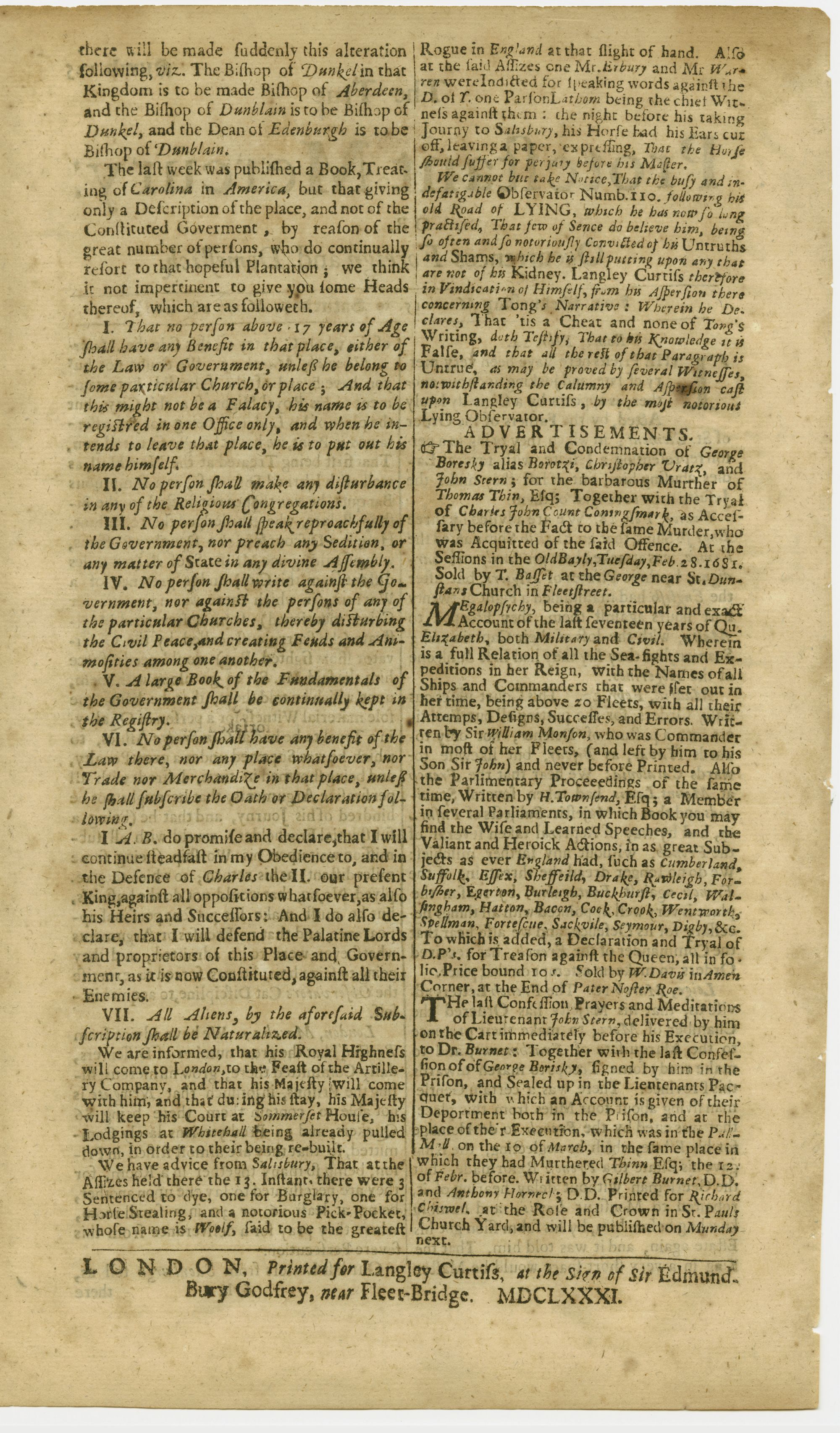 ADVERTISEMENTSThe Tryal and Condemnation of George Boresky alias Borotzi, Christopher Uratz, and John Stern; for the barbarous Murther of Thomas Thin, Esq; together with the Tryal of Charles John Count Coningsmark, as Accessary before the Fact to the same Murder, who was Acquitted of the said Offence. At the Sessions in the Old Bayly, Tuesday, Feb. 28. 1681. Sold by T. Baffet at the George near St. Dunftans Church in Fleetstreet.
