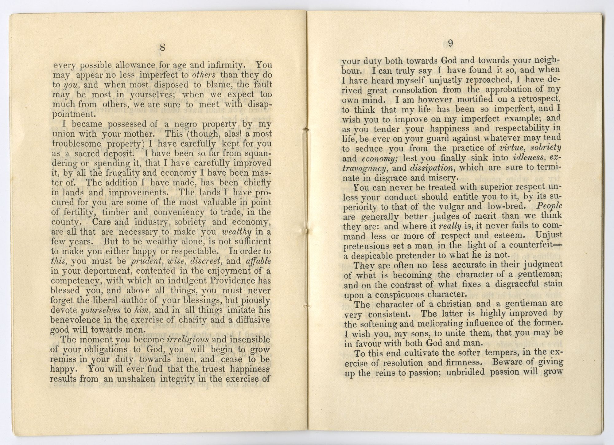 I became possessed of a negro property by my union with your mother. This (though, alas! a most troublesome property) I have carefully kept for you as a sacred deposit. I have been so far from squandering or spending it, that I have carefully improved it, by all the frugality and economy I have been master of. The addition I have made, has been chiefly in lands and improvements. The lands I have pro-cured for you are some of the most valuable in point of fertility, timber and conveniency to trade, in the county. Care and industry, sobriety and economy, are all that are necessary to make you wealthy in a few years. But to be wealthy alone, is not sufficient to make you either happy or respectable. In order to this, you must be prudent, wise, discreet, and affable in your deportment, contented in the enjoyment of a competency, with which an indulgent Providence has blessed you, and above all things, you must never forget the liberal author of your blessings, but piously devote yourselves to him, and in all things imitate his benevolence in the exercise of charity and a diffusive good will towards men.