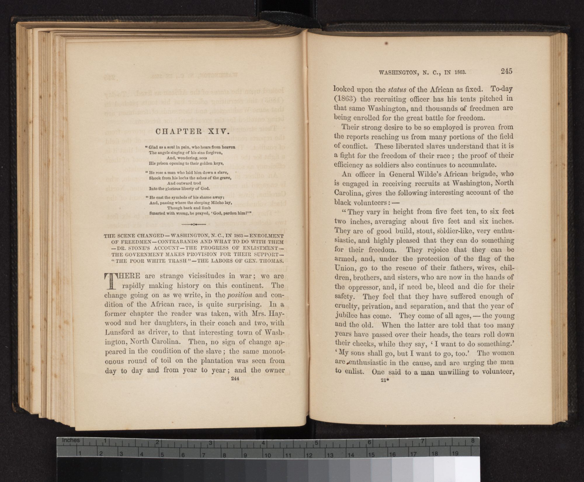 The scene changed—Washington, N. C., in 1863—Enrolment of freedmen — Contrabands, and what to do with them—Dr. Stone's account—The progress of enlistment —The government makes provision for their sup-
