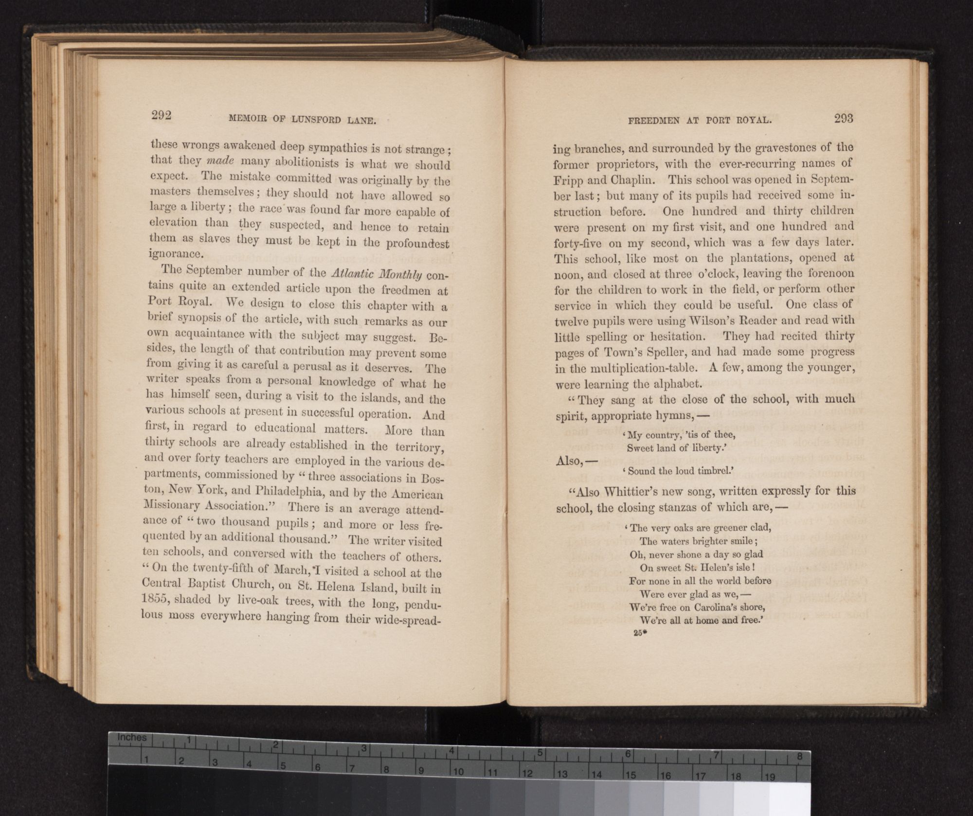 "On the eighth of April, I visited a school on Ladies Island, kept in a small church on the Eustis estate, and taught by a young woman from Kingston, Massachusetts. She had manifested much persistence in going to this field; went with the first delegation, and still keeps the school which she opened in March, 1862. She taught the pupils their letters. Sixty-six were present on the day of my visit. A. class of ten pupils read the story which is found on page eighty-six of Hillard's Second Primary Reader. One girl, Elsie, a full black, and rather ungainly withal, read so rapidly that she had to be checked, the only case of such fast reading that I found. She assisted the teacher by taking the beginners to a corner of the room and exercising them upon an alphabet card, requiring them to give the names of letters taken out of their regular order, which they were expected to repeat after her. One class re-cited in Eaton's First Lessons in Arithmetic, and two or three scholars, with a rod, pointed out the States, lakes, and large rivers on the map of the United States, and also the different continents on the map of the world, as they were called. I saw the teacher of this school, at her residence, late in the afternoon, giving familiar instruction to some ten boys and girls,— all but