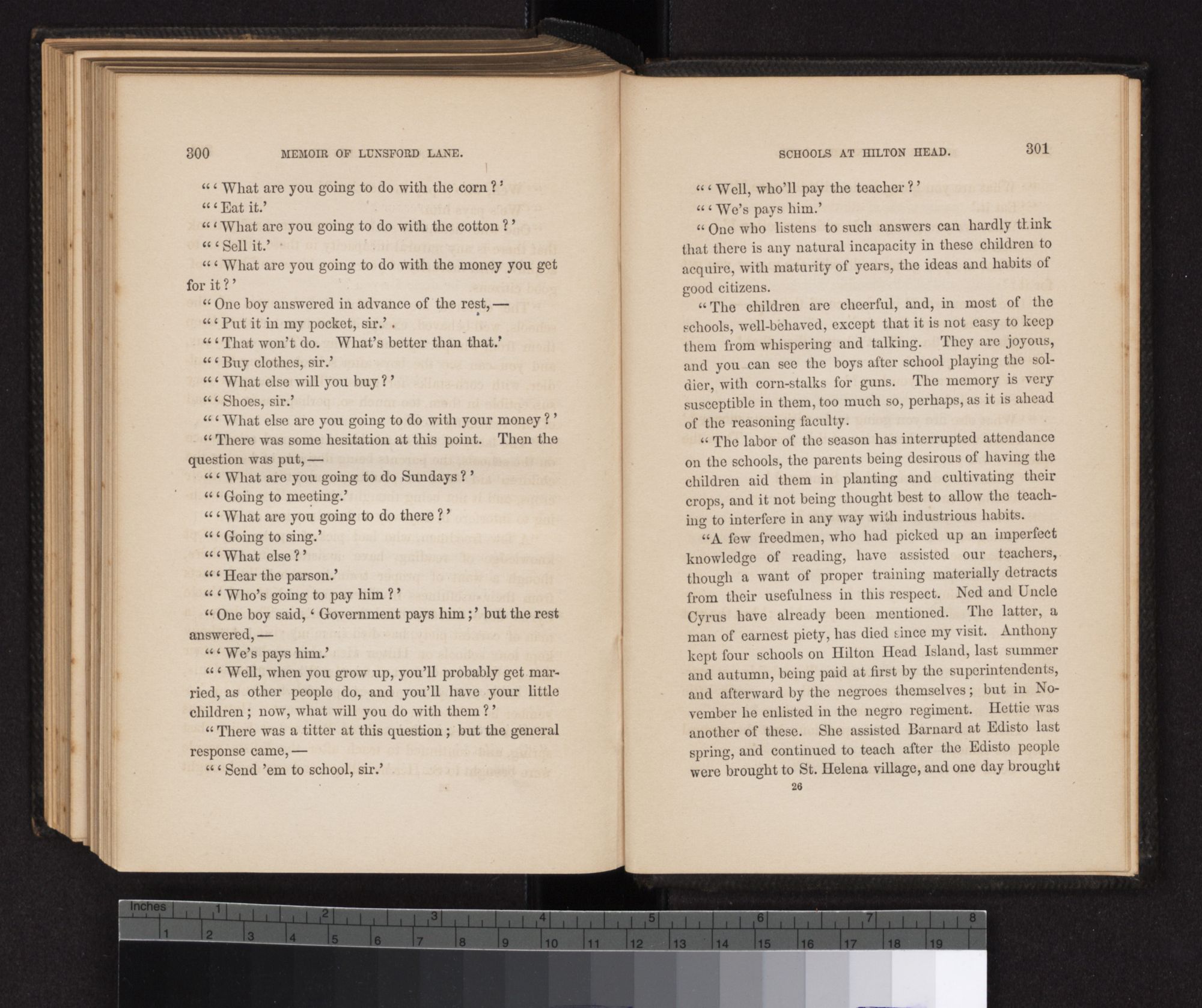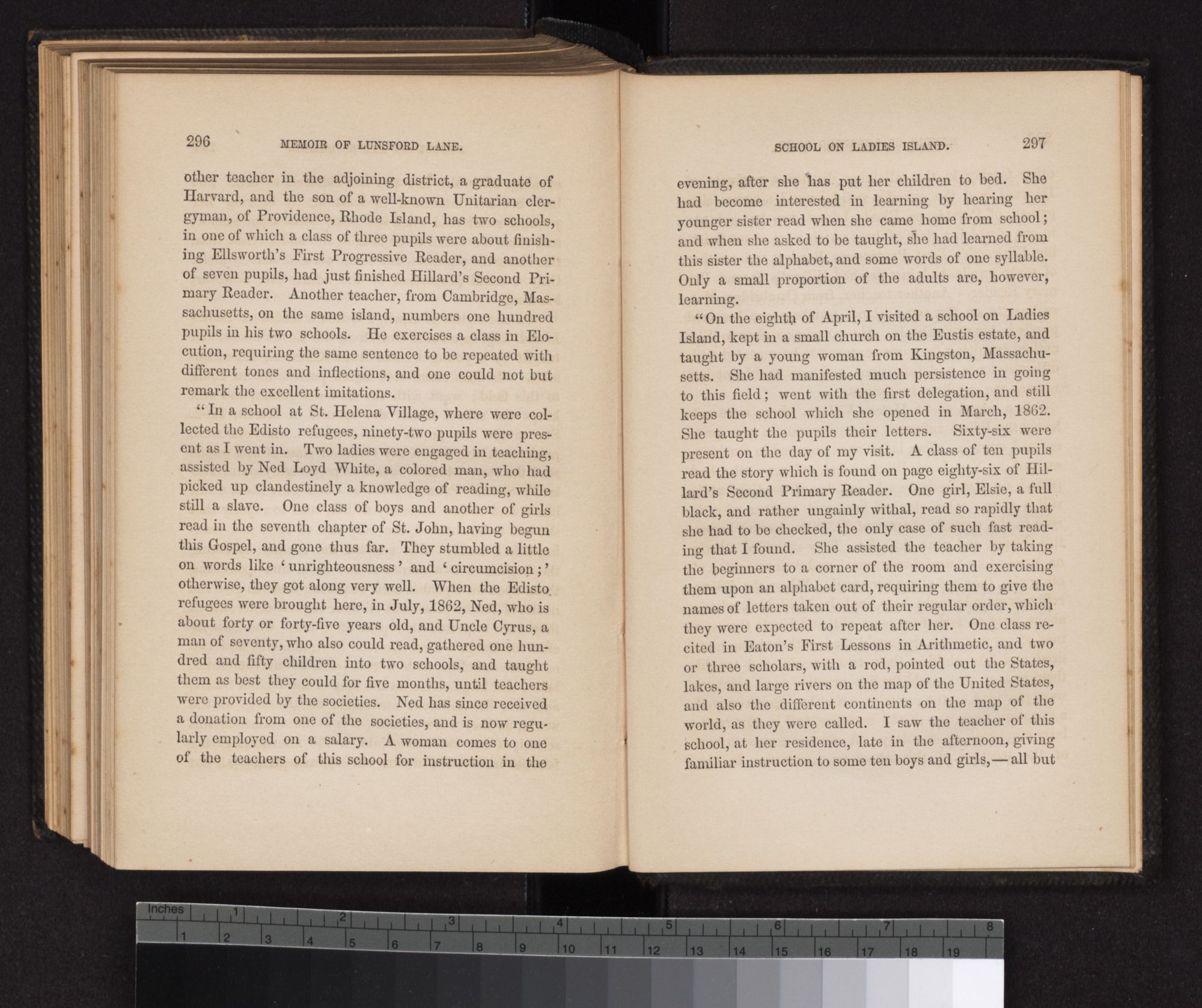 " In a school at St. Helena Village, where were collected the Edisto refugees, ninety-two pupils were present as I went in. Two ladies were engaged in teaching, assisted by Ned Loyd White, a colored man, who had picked up clandestinely a knowledge of reading, while still a slave. One class of boys and another of girls read in the seventh chapter of St. John, having begun this Gospel, and gone thus far. They stumbled a little on words like ' unrighteousness' and ' circumcision;' otherwise, they got along very well. When the Edisto. refugees were brought here, in July, 1862, Ned, who is about forty or forty-five years old, and Uncle Cyrus, a man of seventy, who also could read, gathered one hundred and fifty children into two schools, and taught them as best they could for five months, until teachers were provided by the societies. Ned has since received a donation from one of the societies, and is now regularly employed on a salary. A woman comes to one of the teachers of this school for instruction in the