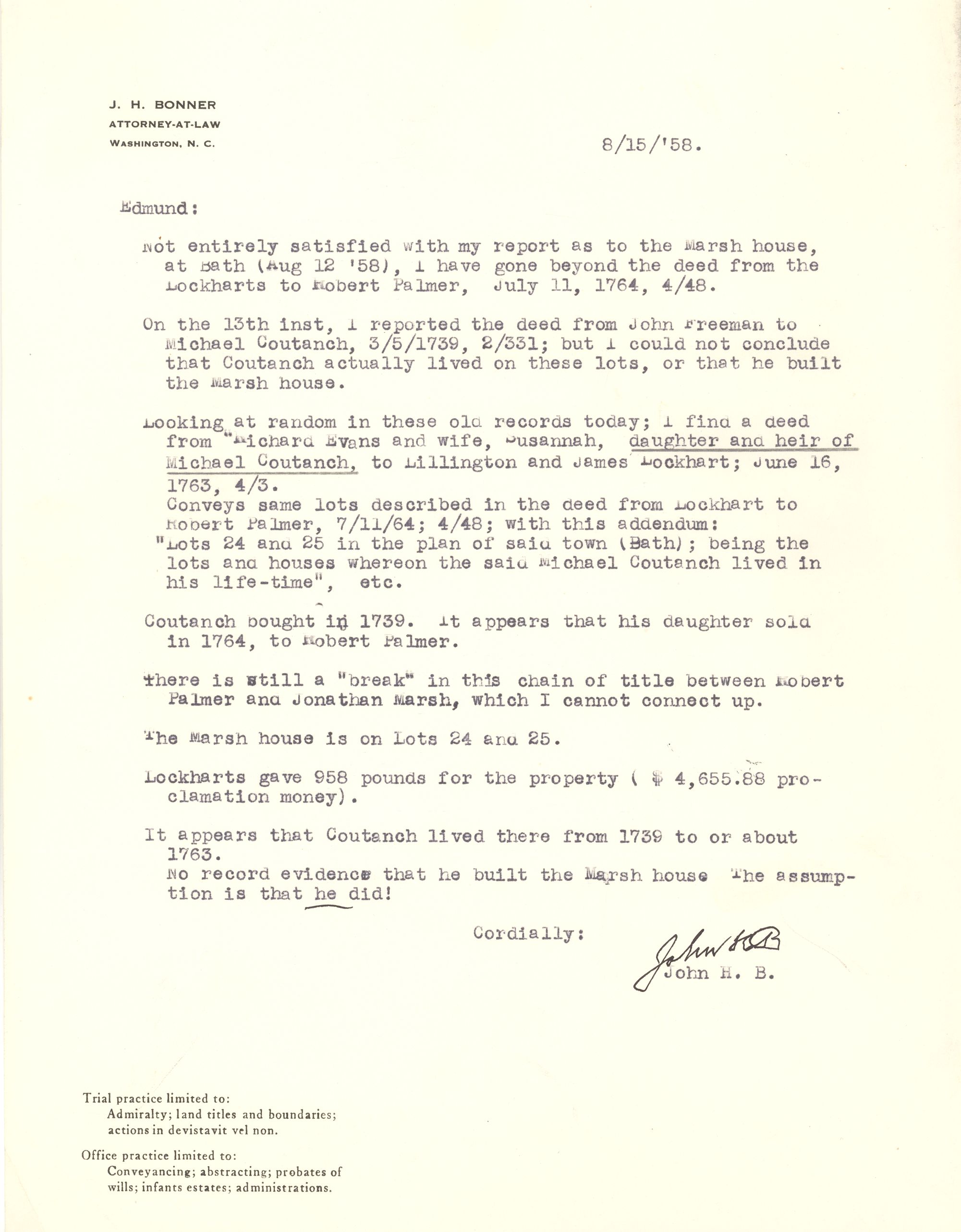 The town of Bath is truly an old settlement. [crossed out: Even] Long before the first settlers from the Albemarle began to filter southward and patent land along the Pamlico, Indians had established a town upon this site. Here was located the principle town of the Pamptico tribe. The Pamptico were members of the great Algonquian family