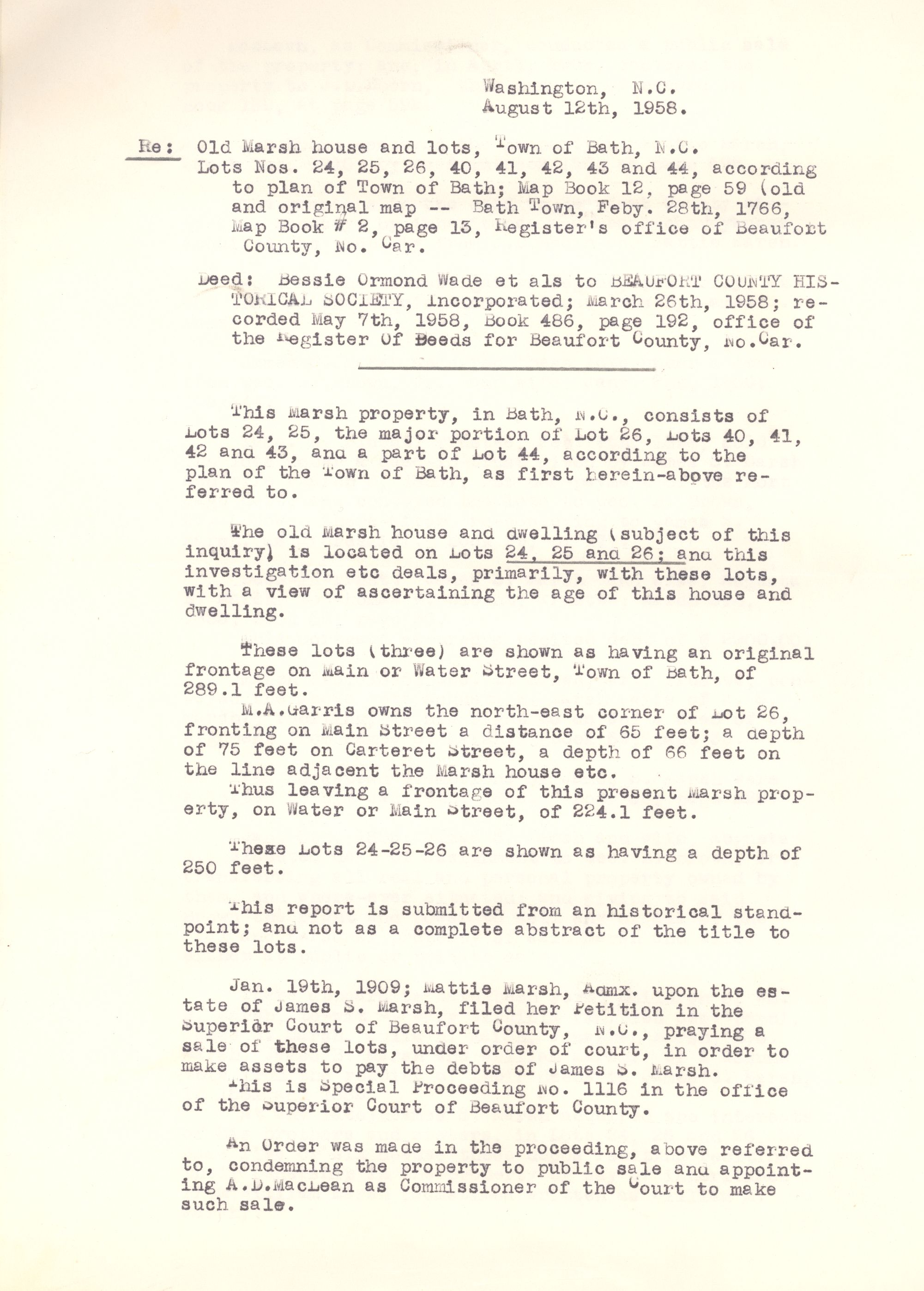 Letter from John H. Bonner to Edmund H. Harding. With information that Michael Coutanch (or Coutanch), a mid-eighteenth-century resident of Bath, had built the house, John H. Bonner went back to the Beaufort County records. In this follow-up report to Edmund H. Harding, chair of the Beaufort County Historical Society, Bonner reports that he has not found enough evidence to credit the building of the house to Coutanche.
