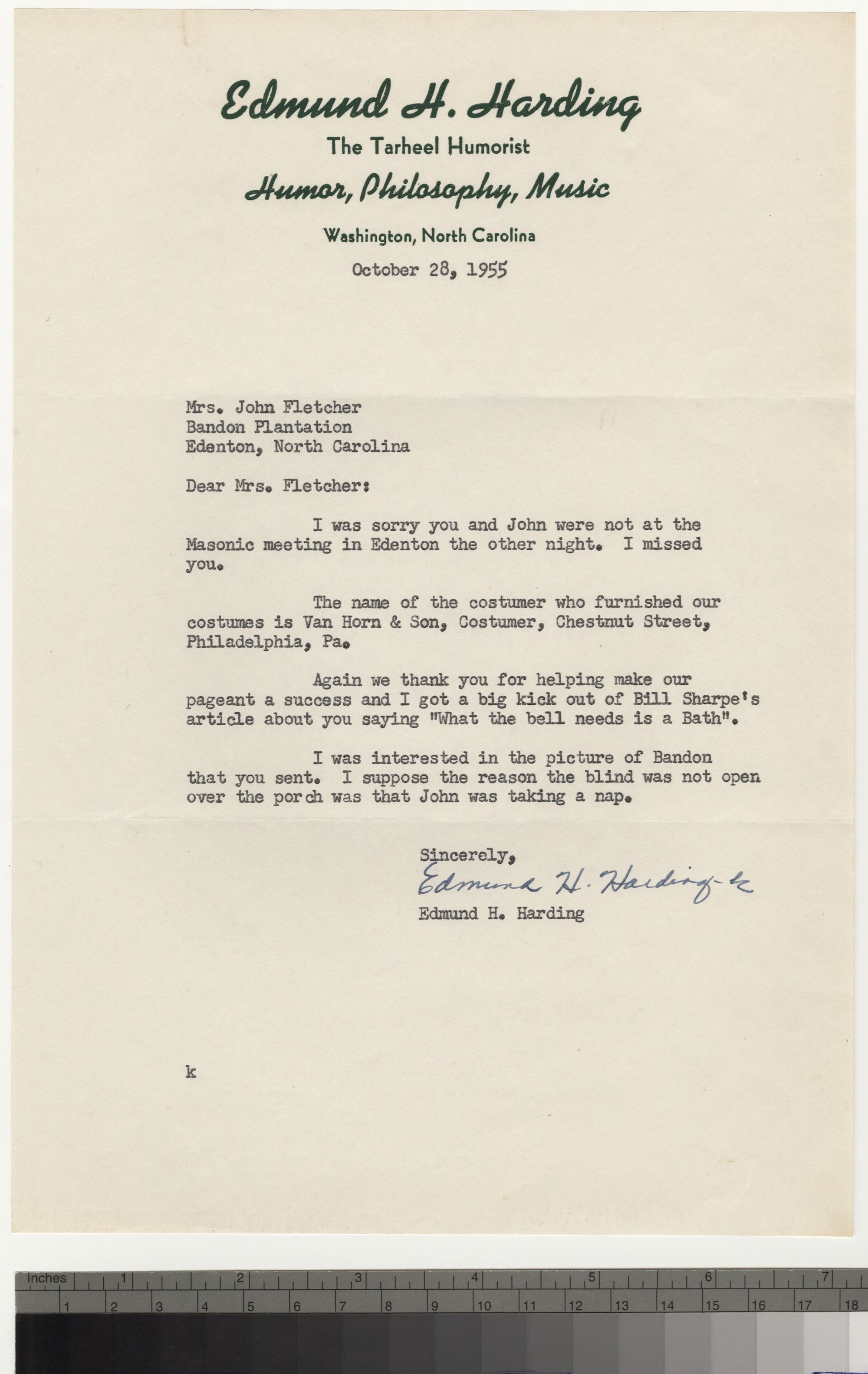 Soon after the Beaufort County Historical Society purchased the Palmer-Marsh house in Bath, Washington, North Carolina attorney John H. Bonner searched the Beaufort County deed books in an attempt to find out who had built the Palmer-Marsh house. The original report led to the two follow-up letters to Edmund Harding.
