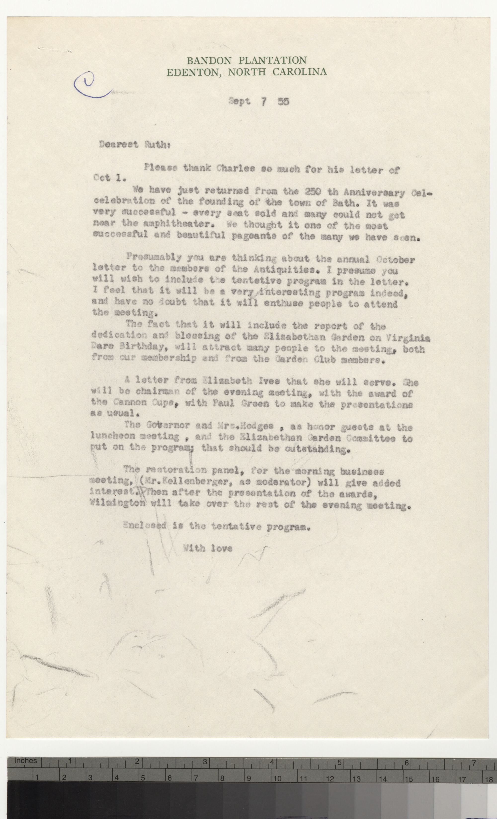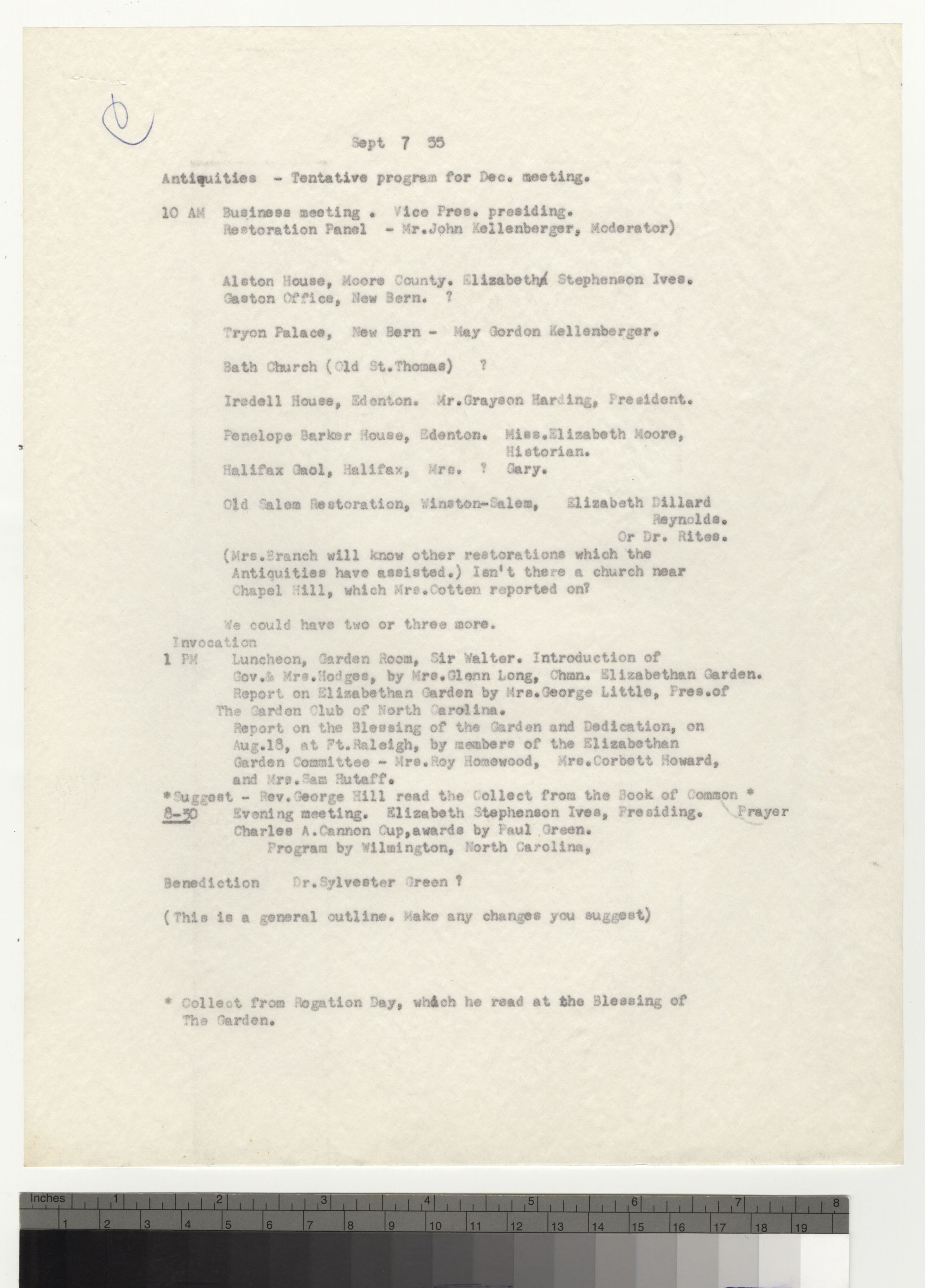 Report on the Blessing of the Garden and Dedication, on Aug. 18, at Ft. Raleigh, by members of the Elizabethan Garden Committee - Mrs. Roy Homewood, Mrs. Corbett Howard, and Mrs. Sam Hutaff. *Suggest - Rev. George Hill read the Collect from the Book of Common * 8-30 Evening meeting. Elizabeth Stephenson Ives, Presiding. Prayer Charles A. Cannon Cup, awards by Paul Green. Program by Wilmington, North Carolina,