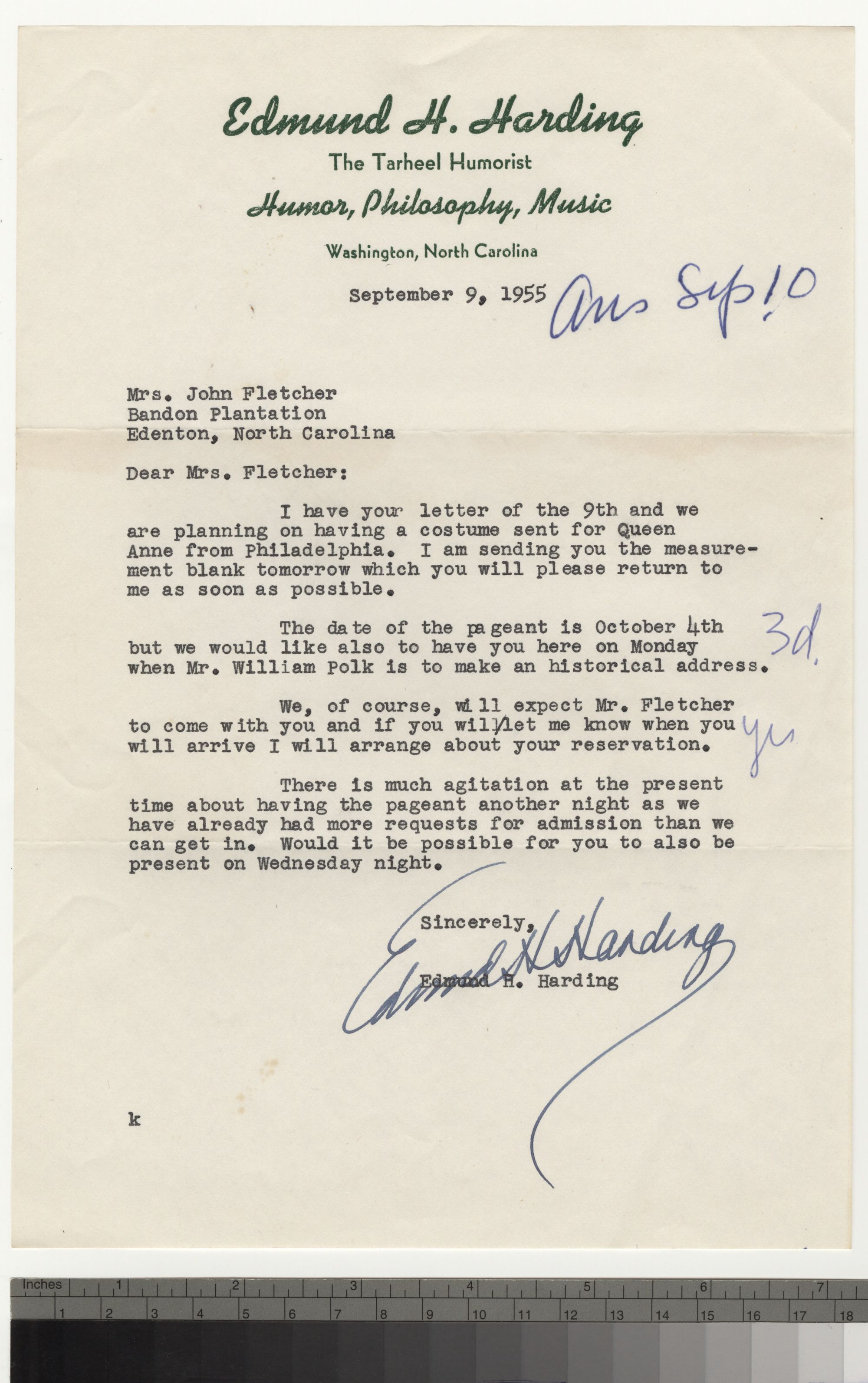 Letter from Edmund Harding to Mrs. Inglis Fletcher about the pageant Queen Anne's Bell performed at the 250th anniversary celebration in Bath, N.C. The letter from Edmund Harding (on personal letterhead--"The Tarheel Humorist / /Humor, Philosophy, Music") mentions her costume for the Bath pageant and about extending the pageant for a second night. The pageant was produced as professionally as possible with lights borrowed from the outdoor drama "The Lost Colony" on Roanoke Island, and as this letter indicates, costumes for many of the performers were rented from out-of-town theatrical costume companies.