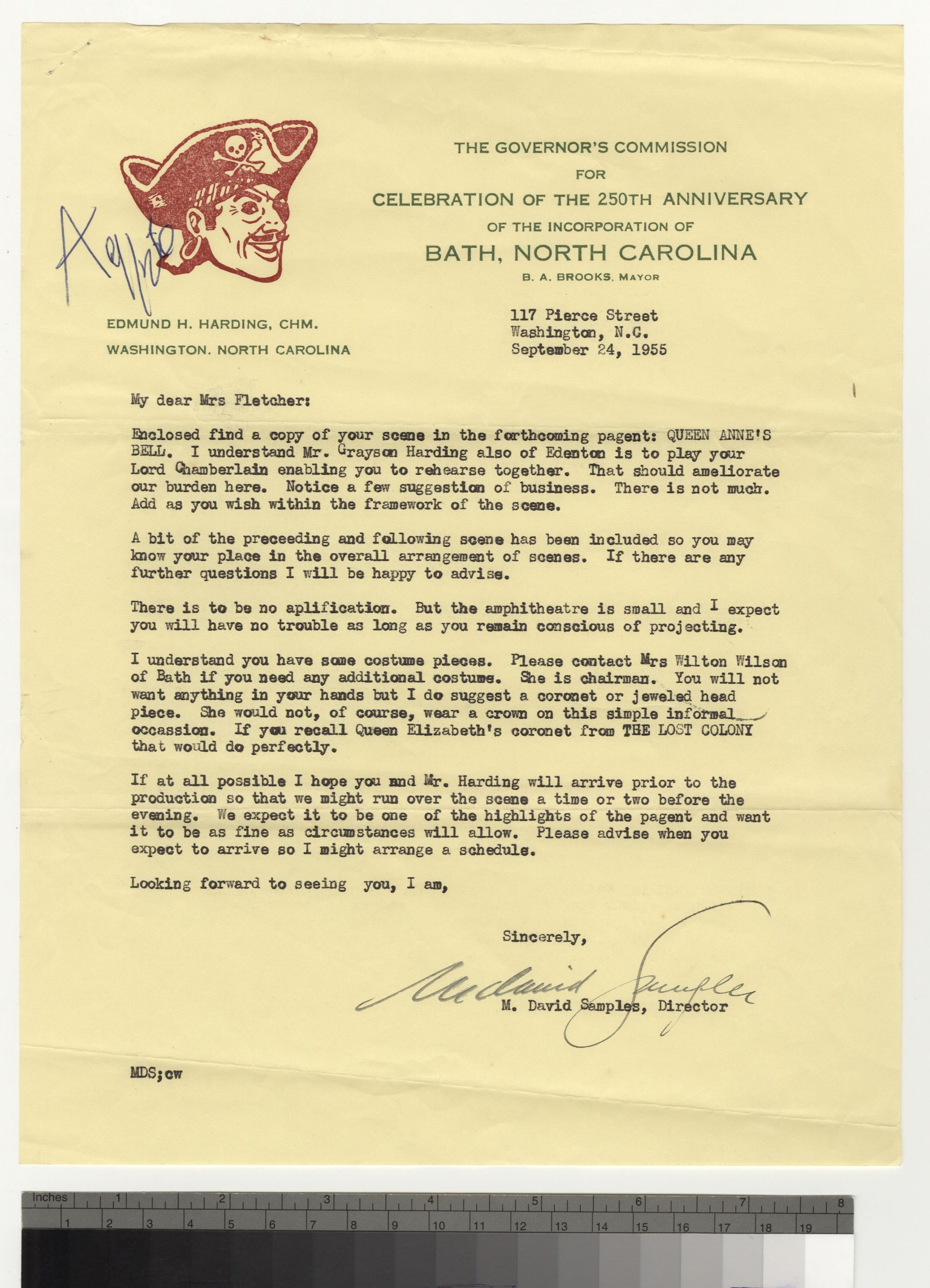 Letter from M. David Samples to Inglis Fletcher. M. David Samples was brought in from Chapel Hill, North Carolina, to direct Queen Anne's Bell pageant for the 250th anniversary celebration in Bath N.C. Handwritten notes can be found on the pages of the script that Samples sent to Inglis Fletcher covering her role as Queen Anne. The darker ones are most likely Samples' directions. The notes in blue, however, may be Fletcher's suggested changes to the script mentioned in her reply to Samples.