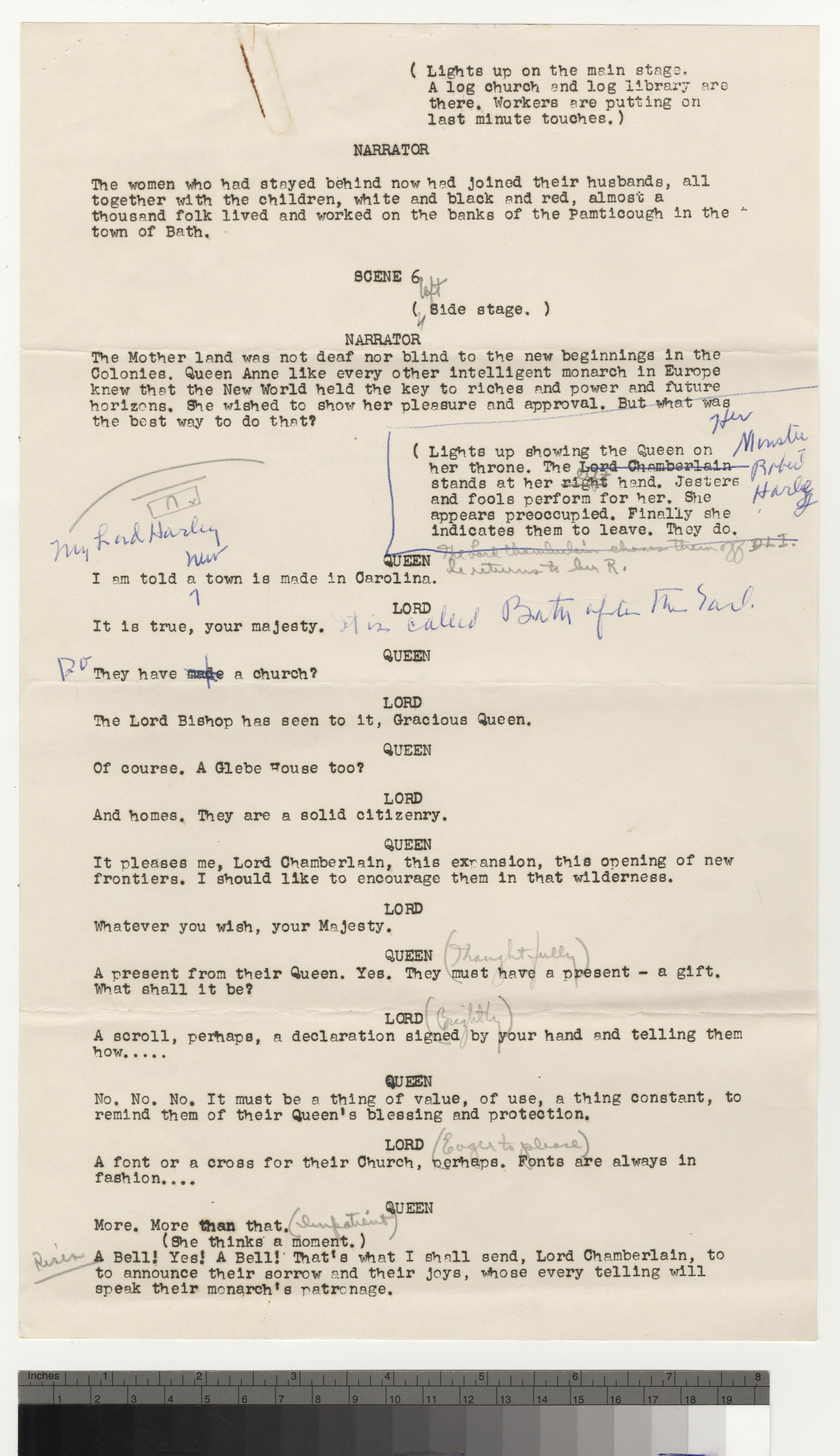 (Lights up on the main stage. A log church and log library are there. Workers are putting on last minute touches.) Narrator The women who had stayed behind now had joined their husbands, all together with the children, white and black and red, almost a thousand folk lived and worked on the banks of the Pamticough in the town of Bath. Scene 6 ([Left] Side stage.) Narrator The Motherland was not deaf nor blind to the new beginnings in the Colonies. Queen Anne like every other intelligent monarch in Europe knew that the New World held the key to riches and power and future horizons. She wished to show her pleasure and approval. But what was the best way to do that? (Lights up showing the Queen on her throne. The Lord Chamberlain [Her Minister Robert Harley] stands at her right [left] hand. Jesters and fools perform for her. She appears preoccupied. Finally she indicates them to leave. They do. [The Lord Chamberlain chases them off DLI. He returns to her R.]) QUEEN [My Lord Harley] I am told a [new] town is made in Carolina. LORD It is true, your majesty. [It is called Bath after the Earl.] QUEEN They have made a church? [Do they have a church?] LORD The Lord Bishop has seen to it, Gracious Queen. QUEEN Of course. A Glebe House too? LORD And homes. They are a solid citizenry. QUEEN It pleases me, Lord Chamberlain, this expansion, this opening of new frontiers. I should like to encourage them in that wilderness. LORD Whatever you wish, your Majesty. QUEEN [(Thoughtfully)] A present from their Queen. Yes. They must have a present - a gift. What shall it be? LORD [(Brightly)] A scroll, perhaps, a declaration signed by your hand and telling them how... QUEEN No. No. No. It must be a thing of value, of use, a thing constant, to remind them of their Queen's blessing and protection. LORD [(Eager to please)] A font or a cross for their Church, perhaps. Fonts are always in fashion.... QUEEN More. More than that. [(Impatient)] (She thinks a moment.) [(Rises)] A Bell! Yes! A Bell! That's what I shall send, Lord Chamberlain, to announce their sorrow and their joys, whose every telling will speak their monarch's patronage.