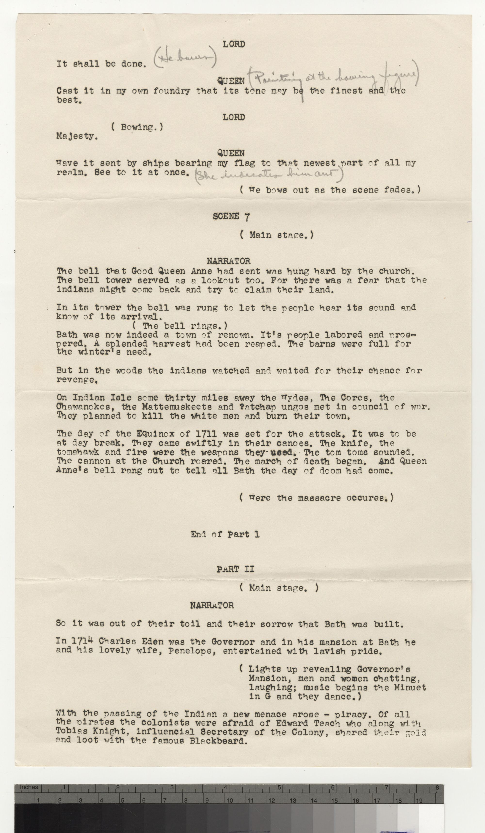LORD It shall be done. [(He bows)] QUEEN [(Painting at the bowing figure)] Cast it in my own foundry that its tone may be the finest and the best. LORD (Bowing.) Majesty. QUEEN Have it sent by ships bearing my flag to that newest part of all my realm. See to it at once. [(She indicates him out)] (He bows out as the scene fades.) SCENE 7 (Main stage.) NARRATOR The bell that Good Queen Anne had sent was hung hard by the church. The bell tower served as a lookout too. For there was a fear that the Indians might come back and try to claim their land. In its tower the bell was rung to let the people hear its sound and know of its arrival. (The bell rings.) Bath was now indeed a town of renown. Its people labored and prospered. A splendid harvest had been reaped. The barns were full for the winter's need. But in the woods the Indians watched and waited for their chance for revenge. On Indian Isle some thirty miles away the Hydes, The Cores, the Chawanckes, the mattemuskeets and ?atchap ungos met in council of war. They planned to kill the white men and burn their town. The day of the Equinox of 1711 was set for the attack. It was to be at day break. They came swiftly in their canoes. The knife, the tomahawk and fire were the weapons they used. The tom toms sounded. The cannon at the Church roared. The march of death began. And Queen Anne's bell rang out to tell all Bath the day of doom had come. (Here the massacre occurs.) End of Part 1 PART II (Main stage.) NARRATOR So it was out of their toil and their sorrow that Bath was built. In 1714 Charles Eden was the Governor and in his mansion at Bath he and his lovely wife, Penelope, entertained with lavish pride. (Lights up revealing Governor's Mansion, men and women chatting, laughing; music begins the Minuet in G and they dance.) With the passing of the Indian a new menace arose - piracy. Of all the pirates the colonists were afraid of Edward Teach who along with Tobias Knight, influential Secretary of the Colony, shared their gold and loot with the famous Blackbeard.