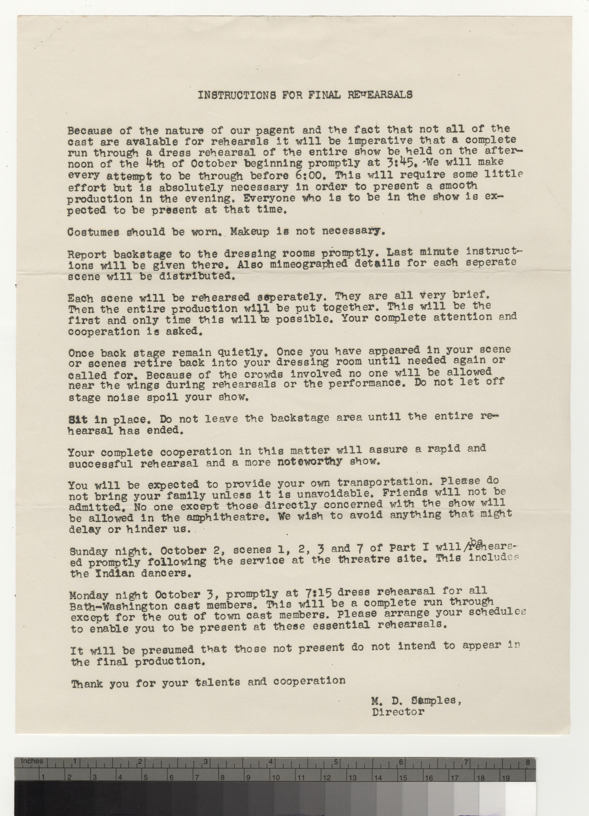 INSTRUCTIONS FOR FINAL REHEARSALS Because of the nature of our pageant and the fact that not all of the cast are available for rehearsals it will be imperative that a complete run through a dress rehearsal of the entire show be held on the afternoon of the 4th of October beginning promptly at 3:45. We will make every attempt to be through before 6:00. This will require some little effort but is absolutely necessary in order to present a smooth production in the evening. Everyone who is to be in the show is expected to be present at that time. Costumes should be worn. Makeup is not necessary. Report backstage to the dressing rooms promptly. Last minute instructions will be given there. Also mimeographed details for each separate scene will be distributed. Each scene will be rehearsed separately. They are all very brief. Then the entire production will be put together. This will be the first and only time this will be possible. Your complete attention and cooperation is asked. Once back stage remain quietly. Once you have appeared in your scene or scenes retire back into your dressing room until needed again or called for. Because of the crowds involved no one will be allowed near the wings during rehearsals or the performance. Do not let off stage noise spoil your show. Sit in place. Do not leave the backstage area until the entire rehearsal has ended. Your complete cooperation in this matter will assure a rapid and successful rehearsal and a more noteworthy show. You will be expected to provide your own transportation. Please do not bring your family unless it is unavoidable. Friends will not be admitted. No one except those directly concerned with the show will be allowed in the amphitheatre. We wish to avoid anything that might delay or hinder us. Sunday night. October 2, scenes 1, 2, 3 and 7 of Part I will [be] rehearsed promptly following the service at the theatre site. This includes the Indian dancers. Monday night October 3, promptly at 7:15 dress rehearsal for all Bath-Washington cast members. This will be a complete run through except for the out of town cast members. Please arrange your schedules to enable you to be present at these essential rehearsals. It will be presumed that those not present do not intend to appear in the final production. Thank you for your talents and cooperation M. D. Samples, Director