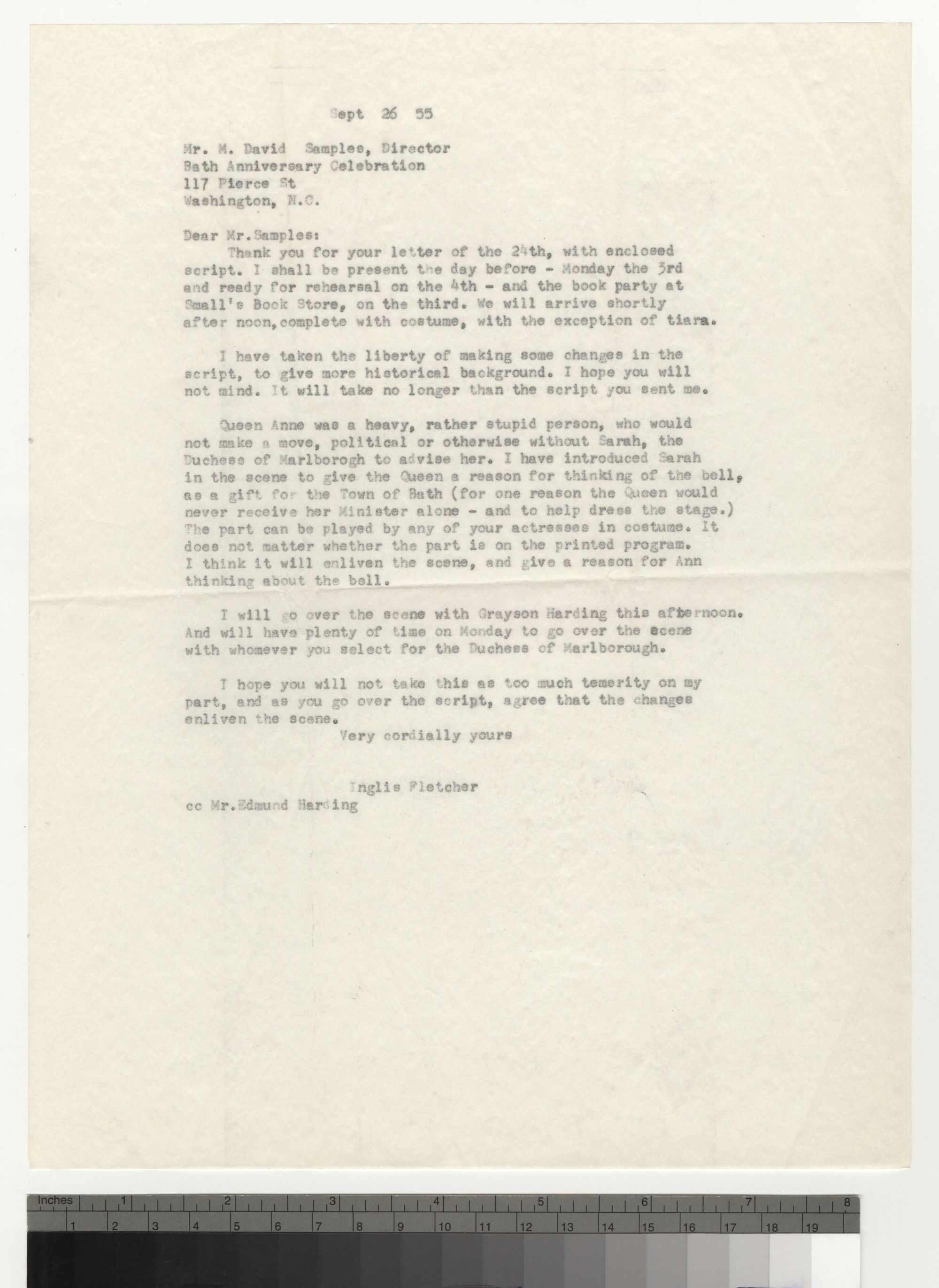 Thank you for your letter of the 24th, which enclosed script. I shall be present the day before - Monday the 3rd and read for rehearsal on the 4th - and the book party at Small's Book Store, on the third. We will arrive shortly after noon, complete with costume, with the exception of tiara.