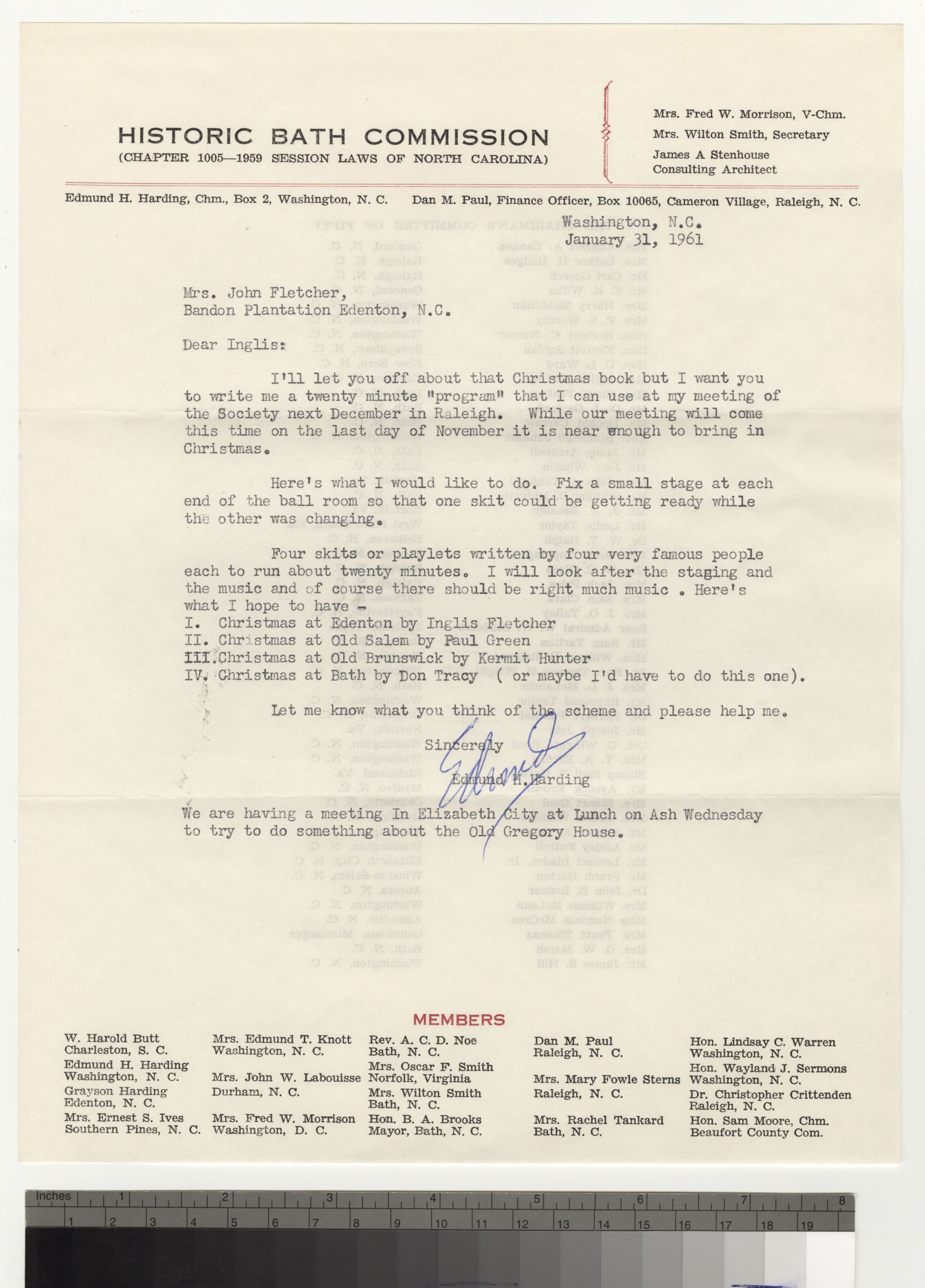 Letter from Edmund H. Harding to Inglis Fletcher that discusses Fletcher's donation of several antiques from her own home in Edenton to help furnish the almost restored Palmer-Marsh house in Bath, N.C.