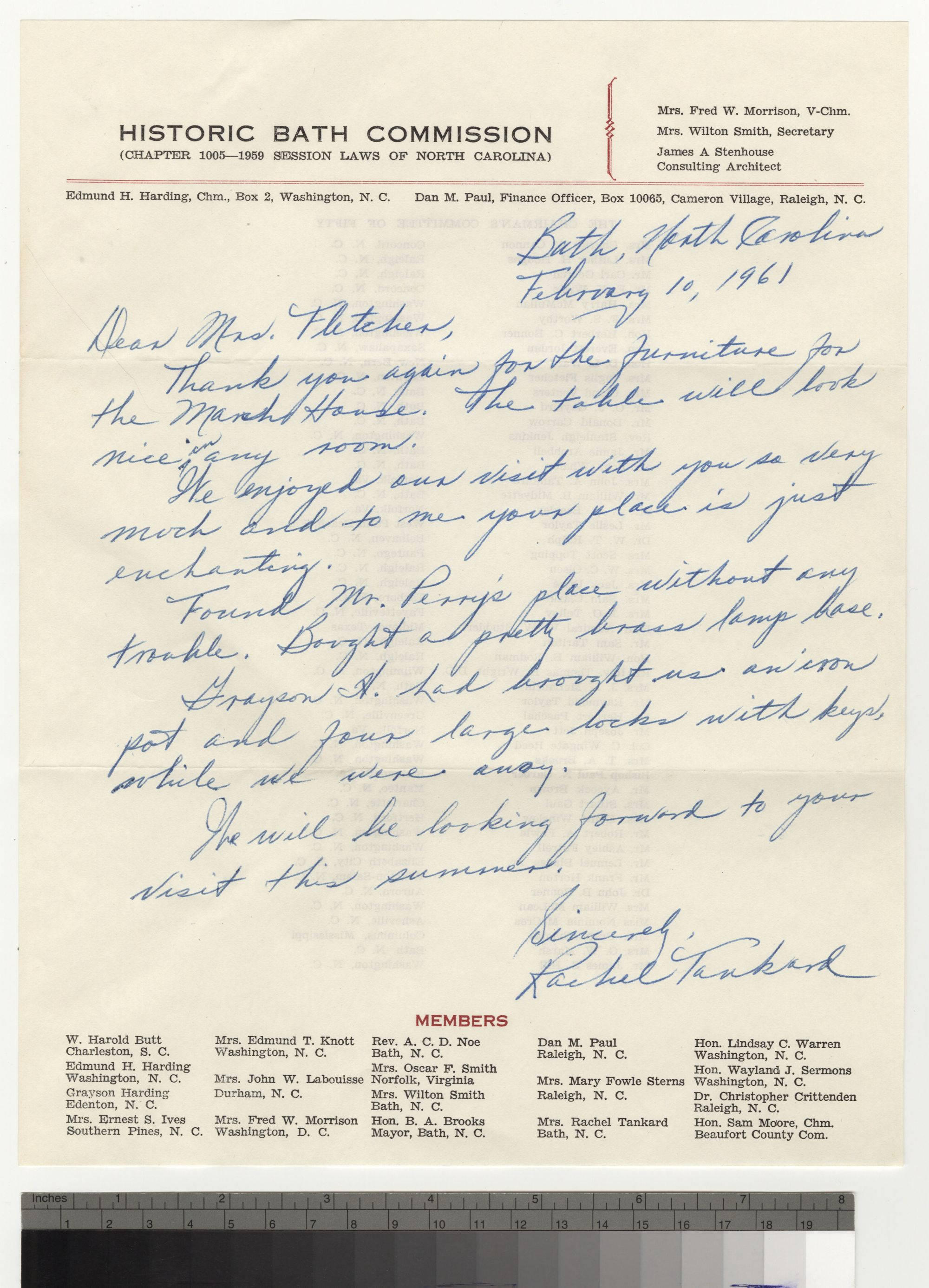 I was once in your home and saw your wonderful library. Which the occasion was to get a table etc. for the Palmar [sic] Marsh House that you had given. And also to recall who I am I was the one who helped you climb up and down the hills the night of Queen Anns [sic] Bell Pageant.