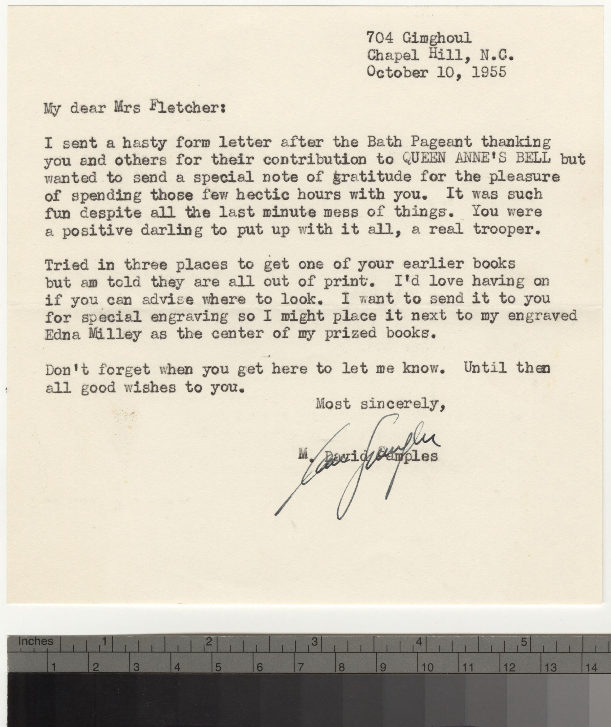 I intended to see you last week and say to you how deeply and sincerely the people of Beaufort County and our area are indebted to you for the magnificent work which you did in connection with the Bath Pageant. I desire, on behalf of my wife and myself, to let you know that we are conscious of the amount of work put in it and how fine a performance the people, under your leadership, made.