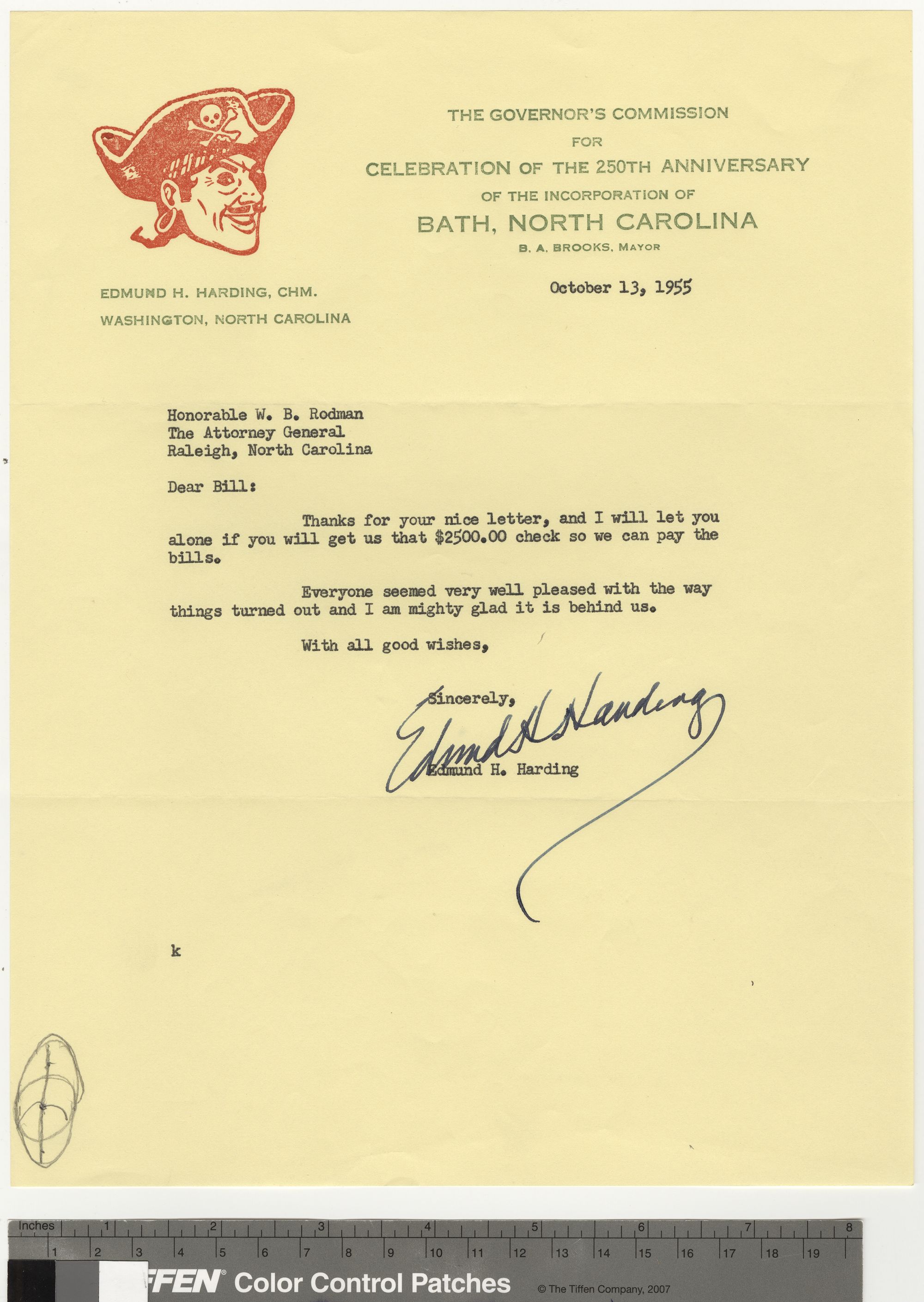 Letter from Bath Mayor Aubrey Lee Brooks to North Carolina Attorney General William Blount Rodman III. Rounds of congratulatory thank you letters were made in the weeks following the 250th anniversary celebration at Bath N.C.