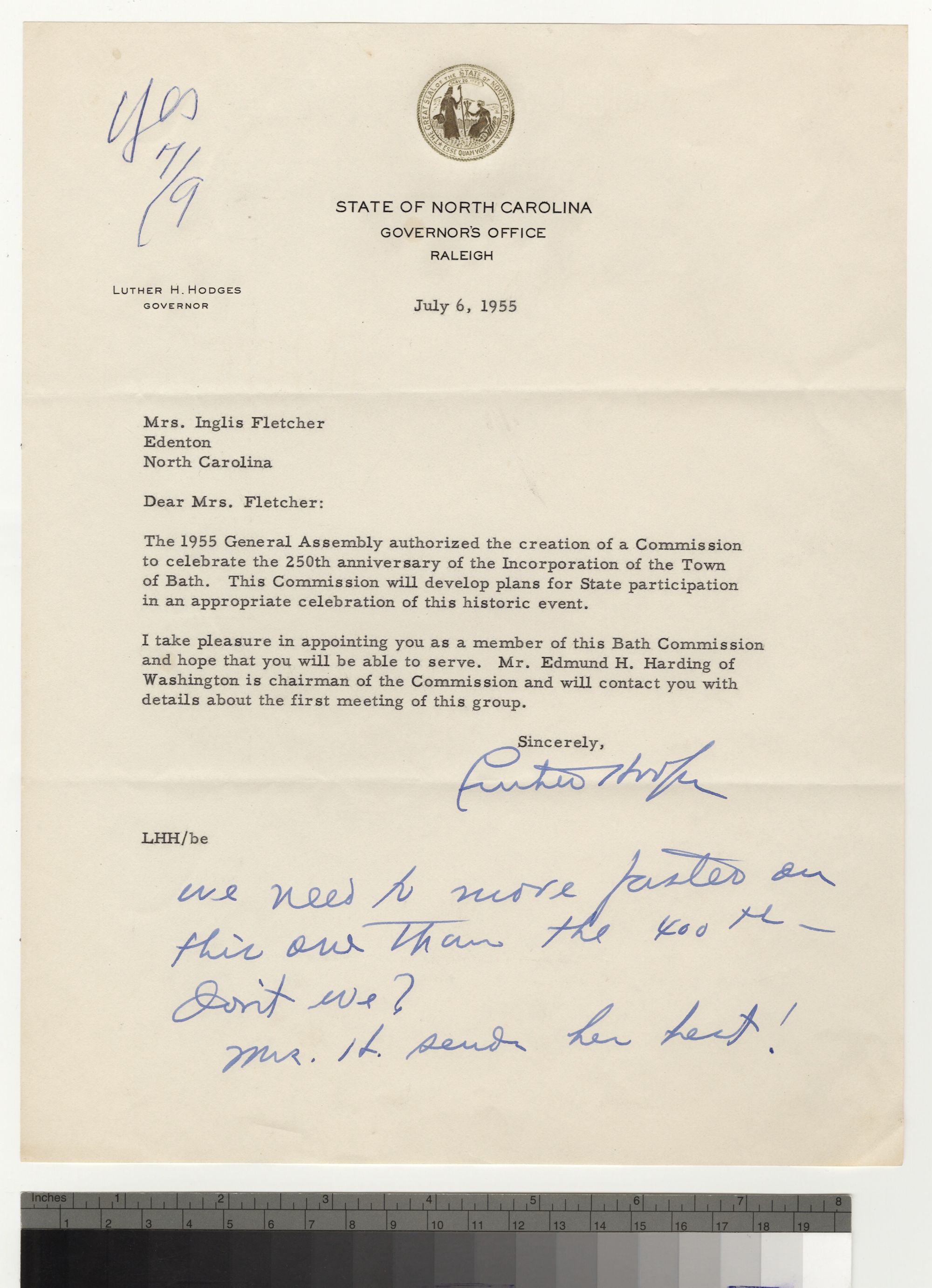 The 1955 General Assembly authorized the creation of a Commission to celebrate the 250th anniversary of the Incorporation of the Town of Bath. This Commission will develop plans for State participation in an appropriate celebration of this historic event.