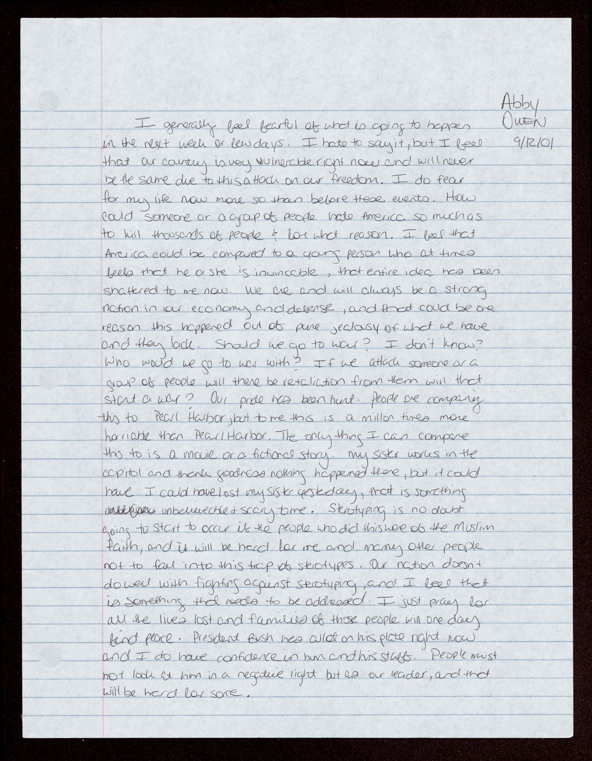 I generally feel fearful of what is going to happen in the next week or a few days. I hate to say it, but I feel that our country is very vulnerable right now and will never be the same due to this attack on our freedom. I do fear for my life now more so before these events. How can someone or group of people hate America so much as to kill thousands of people and for what reason. I feel that America can be compared to a young person who at times feels that he or she is invincible, that entire idea has been shattered to me now. We are and will always be a strong nation in our economy and defense, and that could be one reason this happened out of pure jealousy of what we have and they lack. Should we go to war? I don't know? Who would we go to war with? If we attack someone or group of people would there be retaliation from them will that start a war? Our pride has been hurt. People are comparing this to Pearl Harbor, but to me this is one million times more horrible and Pearl Harbor. The only thing I can compare this to is a movie or fictional story. My sister was in the capital and thanks goodness nothing happened there, but it could have, I could have lost my sister yesterday that is something unbelievable and scary to me. Stereotyping is no doubt going to start to occur if the people who did this were of the Muslim faith, and it will be hard for me and many other people not to fall into this trap of stereotypes. Our nation doesn't do well with fighting against stereptyping, and I feel that is something that needs to be addressed. I just pray for all the lives lost and families of those people who will one day find peace. President Bush has a lot on his plate right now and I do have confidence in him and his staff. People must not look at hand and a negative light but as our leader, and that will be hard for some.