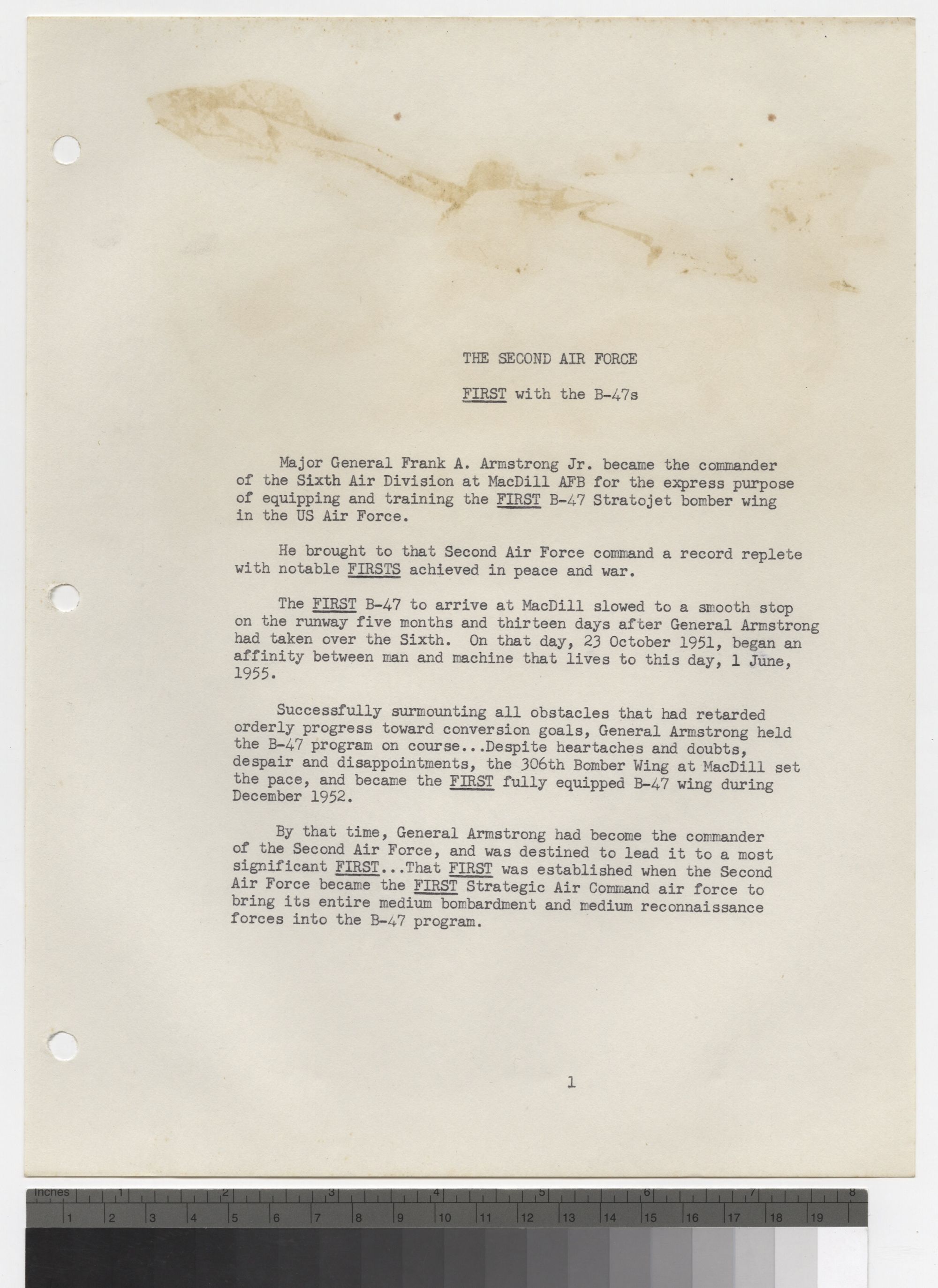 Successfully surmounting all obstacles that had retarded orderly progress toward conversion goals, General Armstrong held the B-47 program on course.Despite heartaches and doubts, despair and disappointments, the 306th Bomber Wing at MacDill set the pace, and became the FIRST fully equipped B-47 Wing during December 1952.