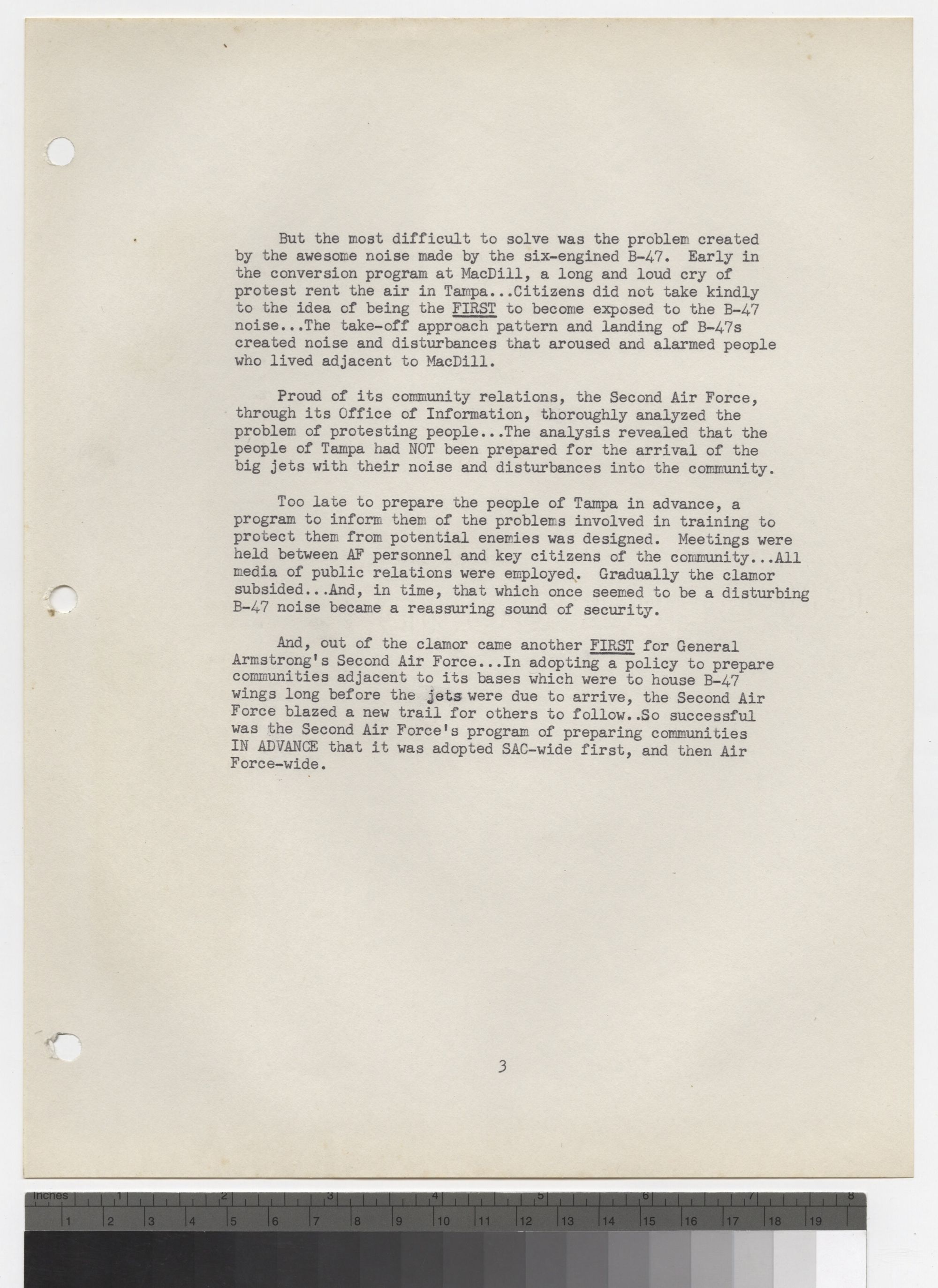 But most difficult to solve was the problem created by the awesome noise made by the six-engined B-47. Early in the conversion program at MacDill, a long and loud cry of protest rent the air in Tampa. Citizens did not take kindly to the idea of being the FIRST to become exposed to the B-47 noise . the take-off approach pattern and landing of B-47s created noise and disturbances that aroused and alarmed people who lived adjacent to MacDill.