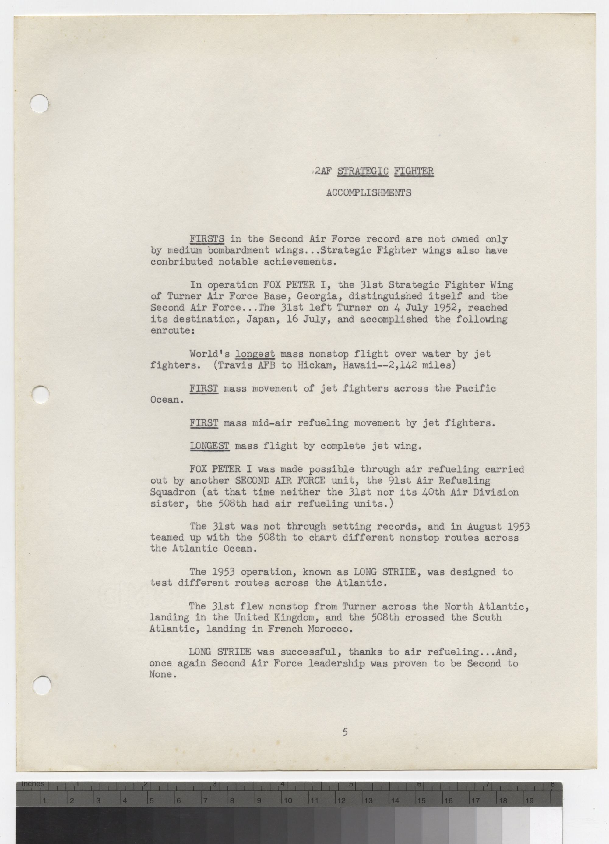 In operations FOX PETER I, the 31st Strategic Fighter Wing of Turner Air Force Base, Georgia, distinguished itself and the Second Air Force. The 31st left Turner on 4 July 1952, reached its destination, Japan, 16 July, and accomplished the following enroute: