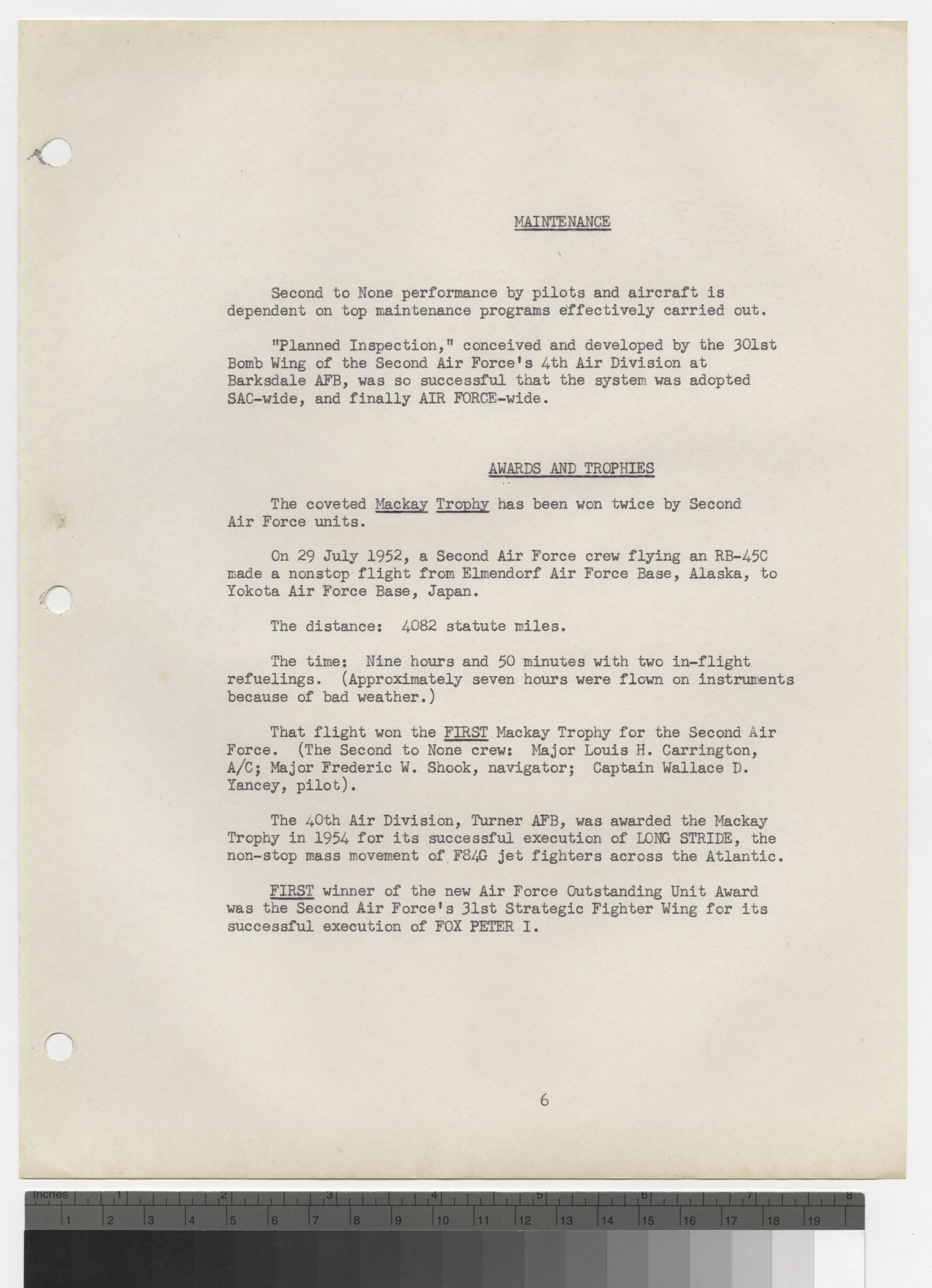 The flight won the FIRST Mackay Trophy for the Second Air Force. (The Second to None crew: Major Louis H. Carrington, A/C; Major Fredric W. Shook, navigator; Captain Wallace D. Yancey, pilot).