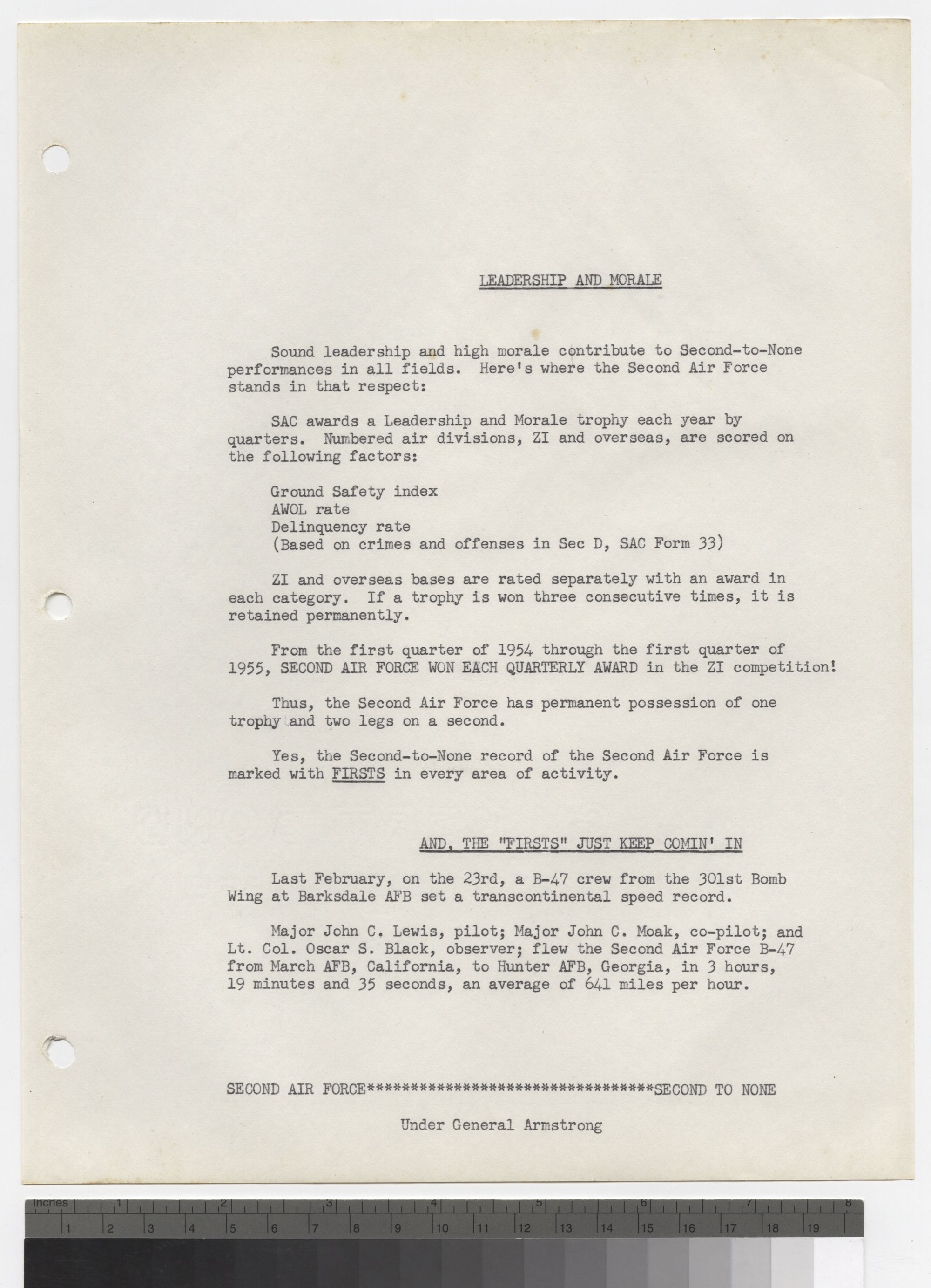 B-47 conversion progress in General Armstrong's Second Air Force set the pace in 1954 to achieve that earlier mentioned Significant FIRST. FIRST, Second to None, in SAC's B-47 program.