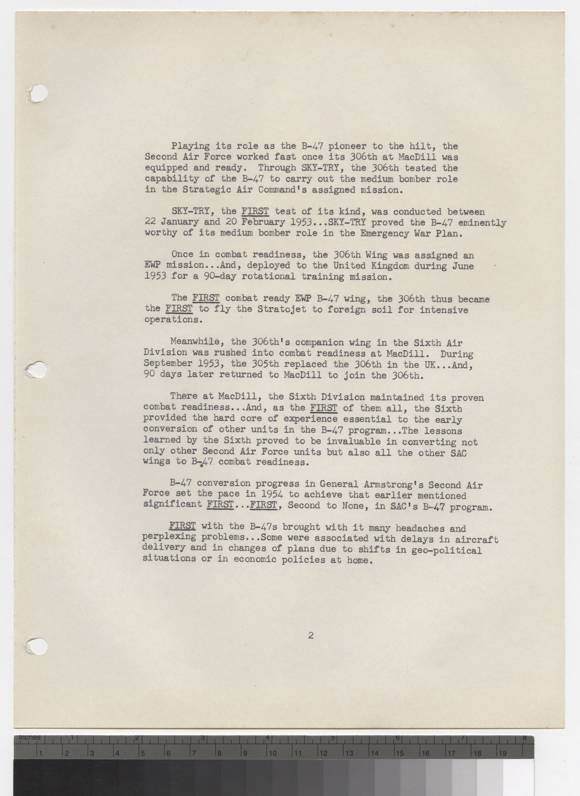 B-47 conversion progress in General Armstrong's Second Air Force set the pace in 1954 to achieve that earlier mentioned Significant FIRST. FIRST, Second to None, in SAC's B-47 program.