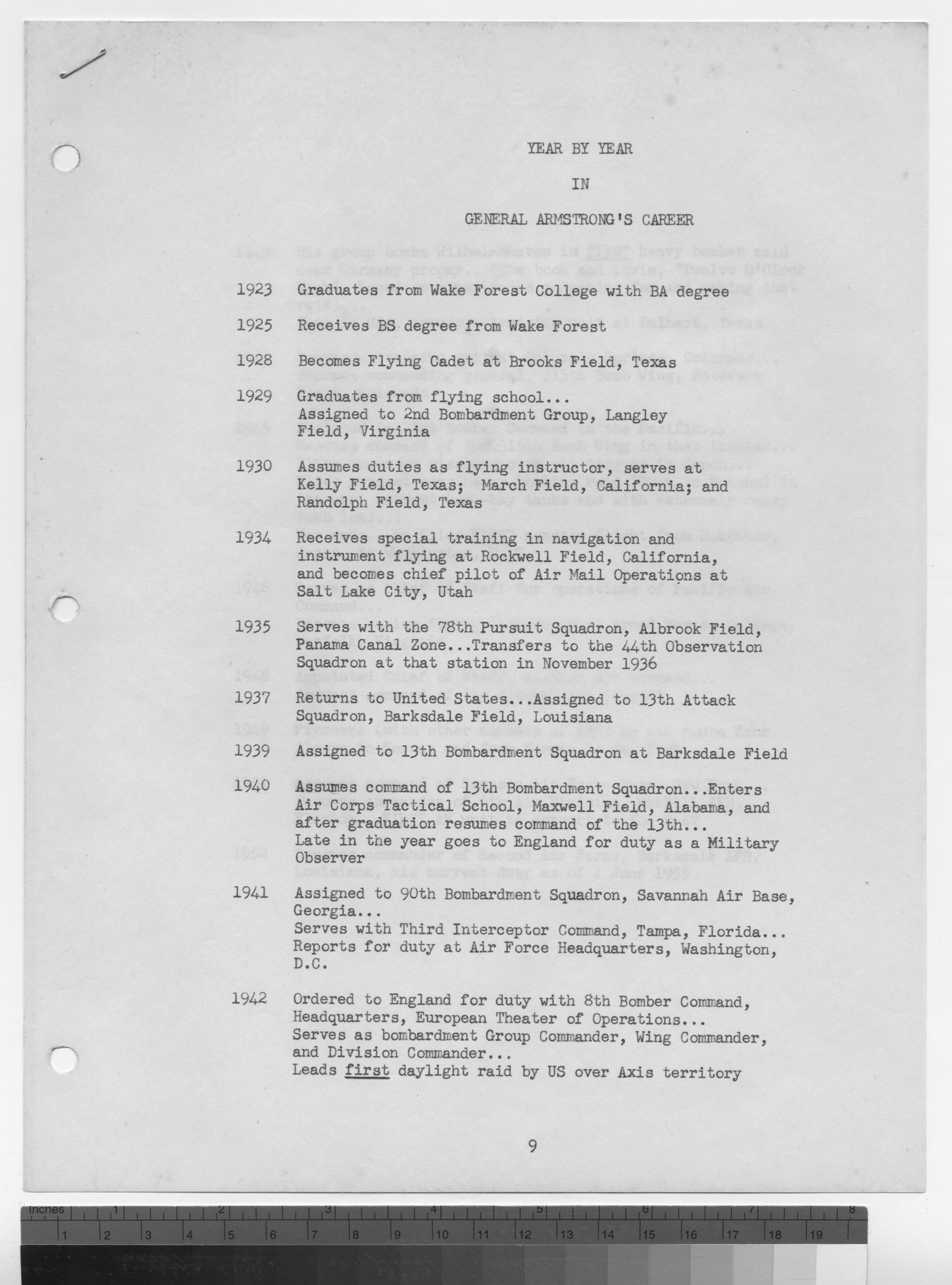 1940 Assumes command of 13th Bombardment Squadron . Enters Air Corps Tactical School, Maxwell Field, Alabama, and after graduation resumes command of the 13th. Late in the year goes to England for duty as a Military Observer