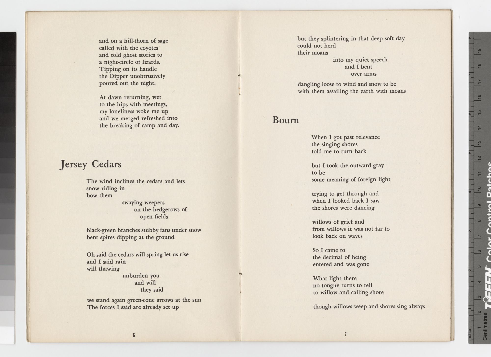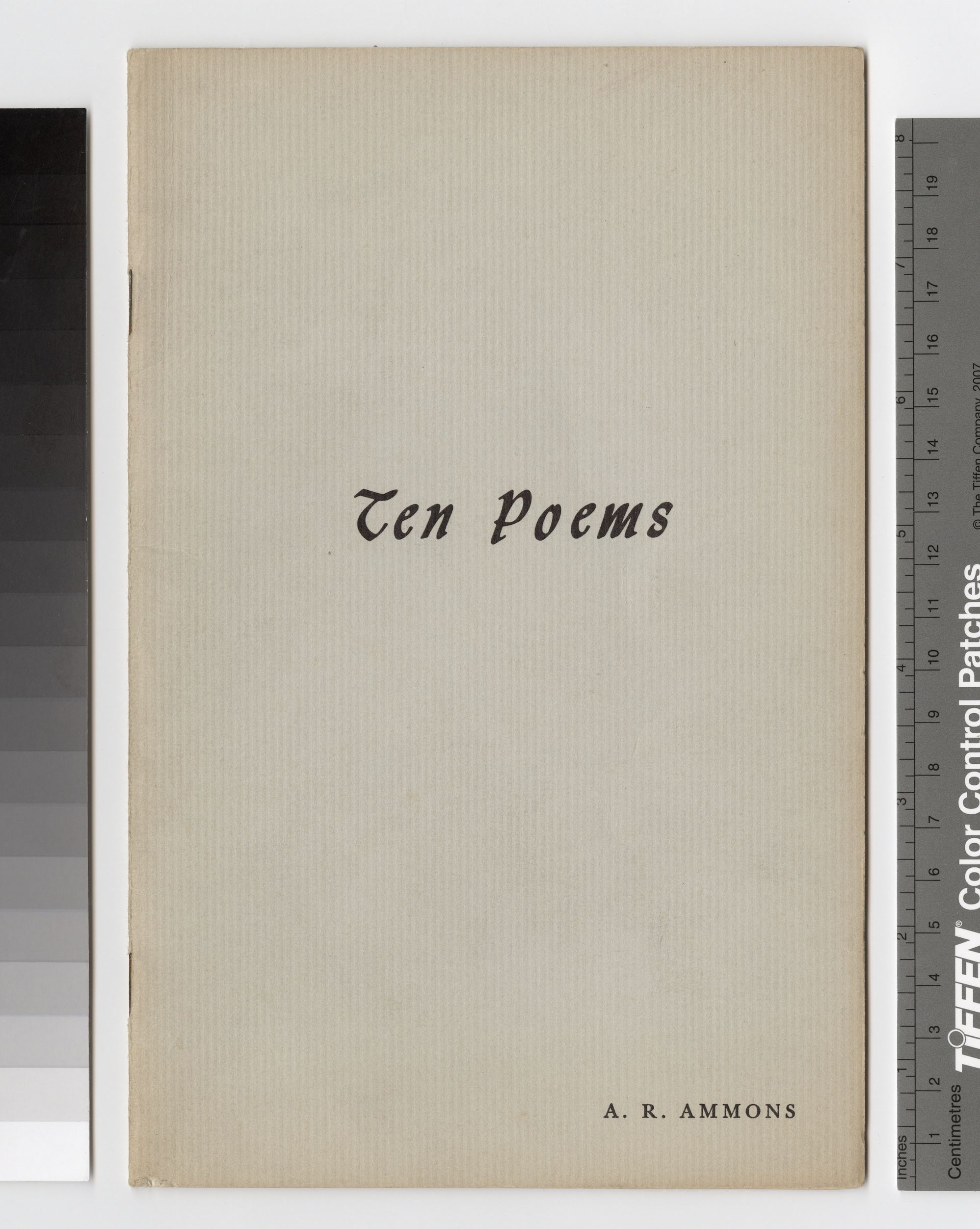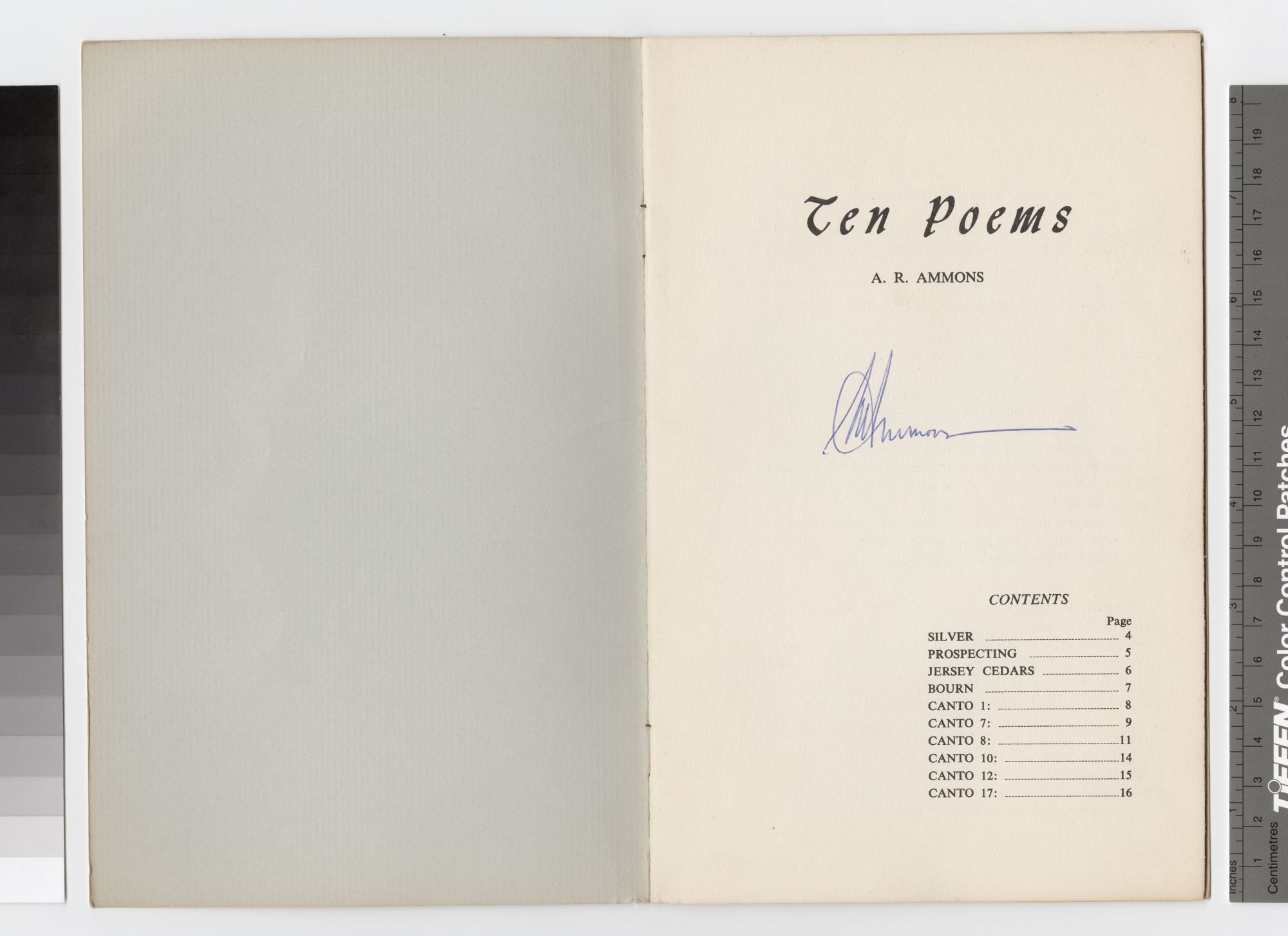 Ten poems, by A.R. Ammons. Reprinted from The Hudson review, vol. XXIII, no. 3, Autumn, 1960. 17 numbered pages. Autographed by A.R. Ammons on front fly-leaf.