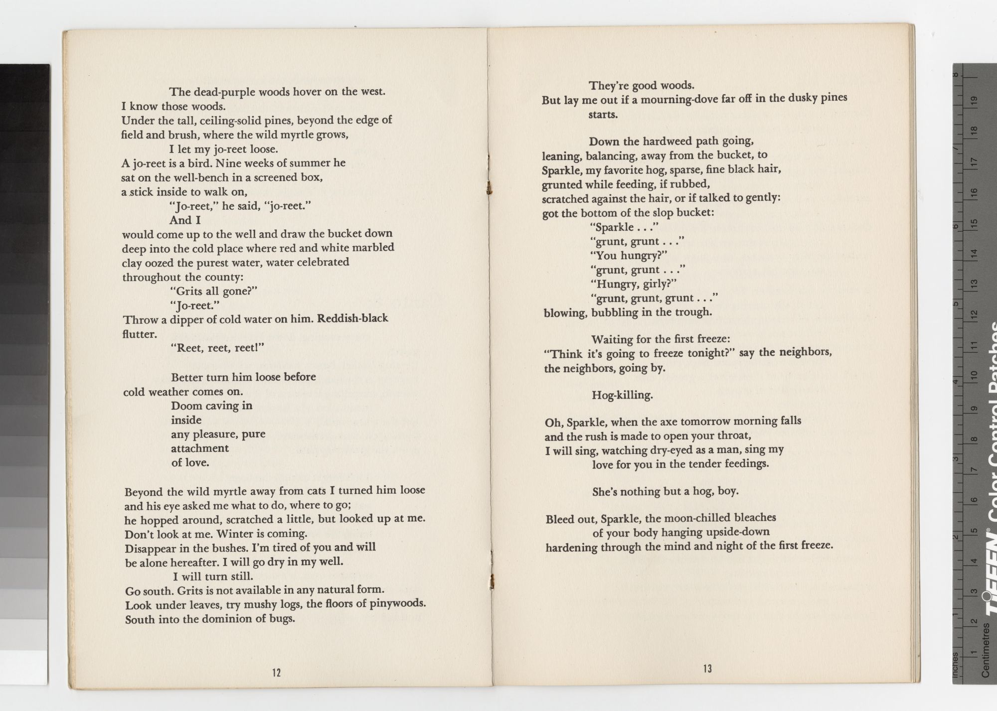 Down the hardweed path going, leaning, balancing, away from the bucket, to Sparkle, my favorite hog, sparse, fine black hair, grunted while feeding, if rubbed, scratched against the hair, or if talked to gently: got the bottom of the slop bucket: