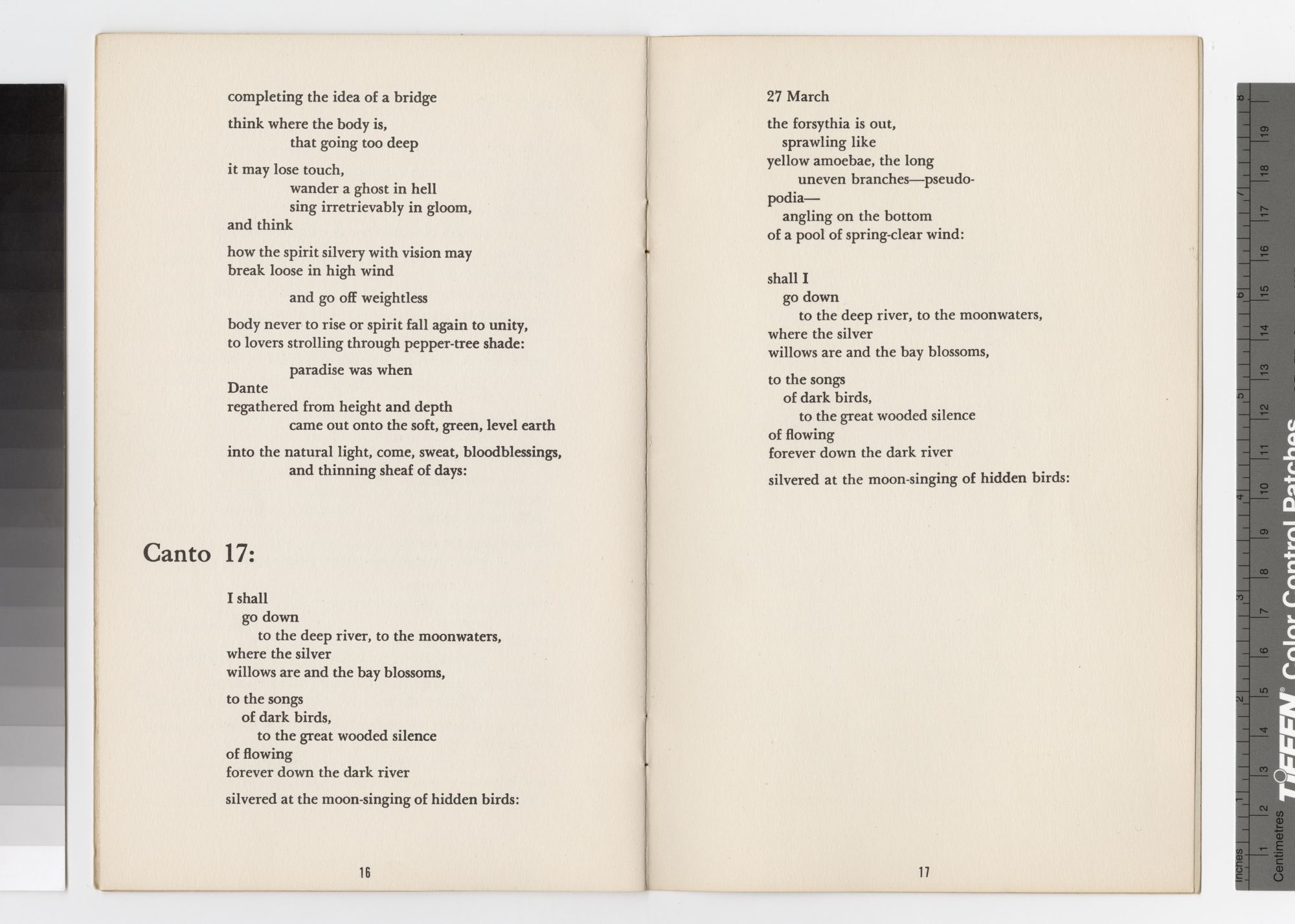 Canto 17: I shall go down to the deep river, to the moonwaters, where the silver willows are and the bay blossoms, to the songs of dark birds, to the great wooded silence of lowing forever down the dark river silvered at the moon-singing of hidden birds