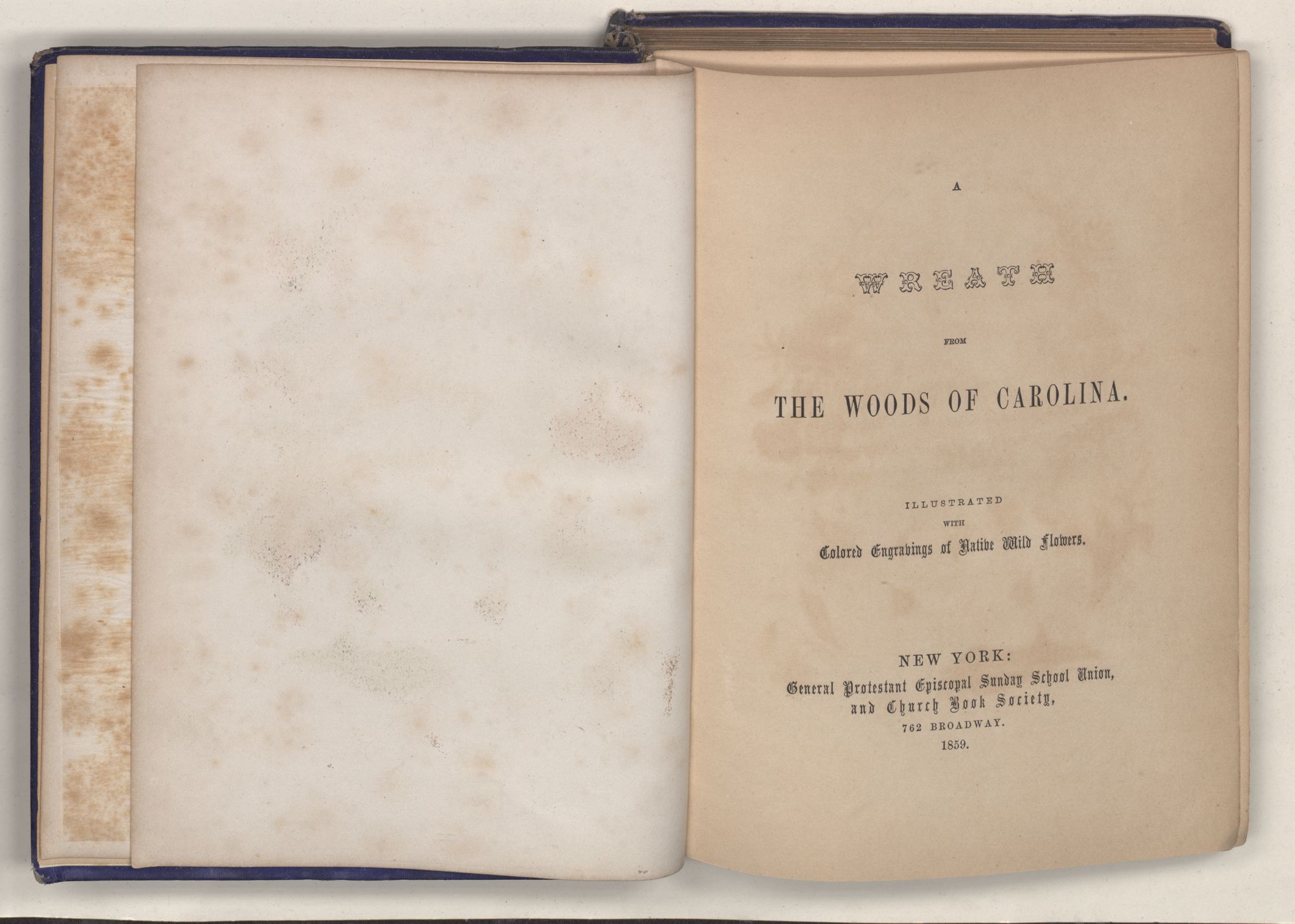 A WREATH FROM THE WOODS OF CAROLINA. ILLUSTRATED WITH Colored Engravings of Native Wild Flowers.NEW YORK:General Protestant Episcopal Sunday School Union,and Church Book Society,762 BROADWAY.1859.