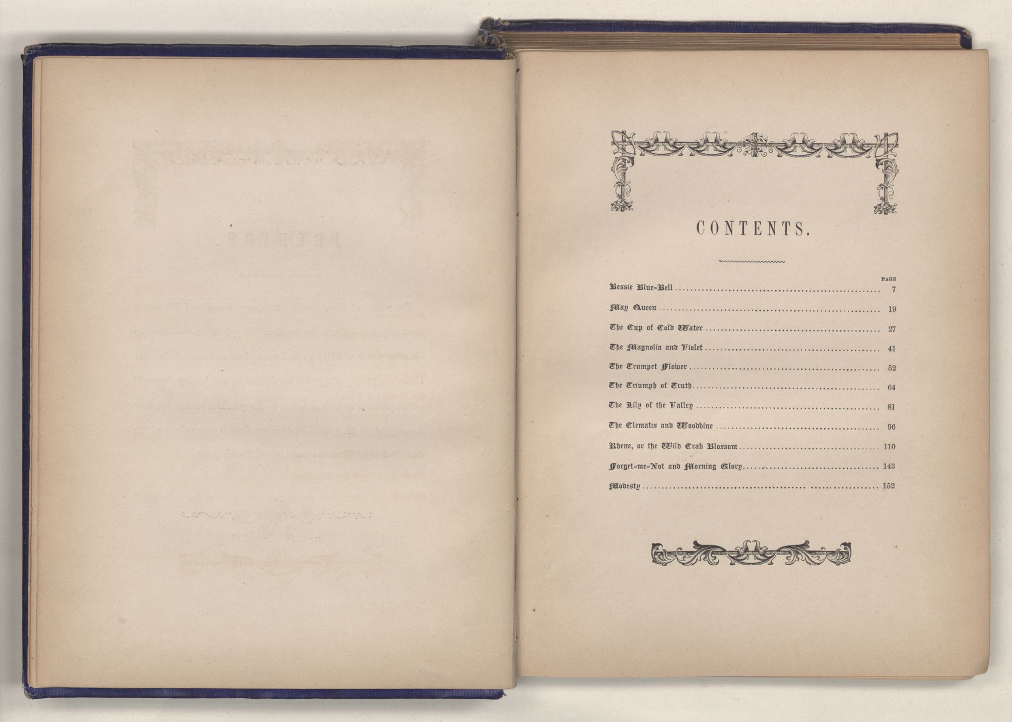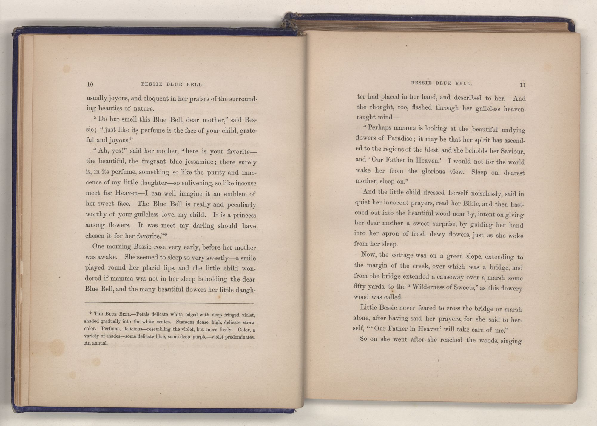 “Ah, yes!” said her mother, “here is your favorite—the beautiful, the fragrant blue jessamine; there surely is, in its perfume, something so like the purity and innocence of my little daughter—so enlivening, so like incense meet for Heaven—I can well imagine it an emblem of her sweet face. The Blue Bell is really and peculiarly worthy of your guileless love, my child. It is a princess among flowers. It was meet my darling should have chosen it for her favorite.”*
