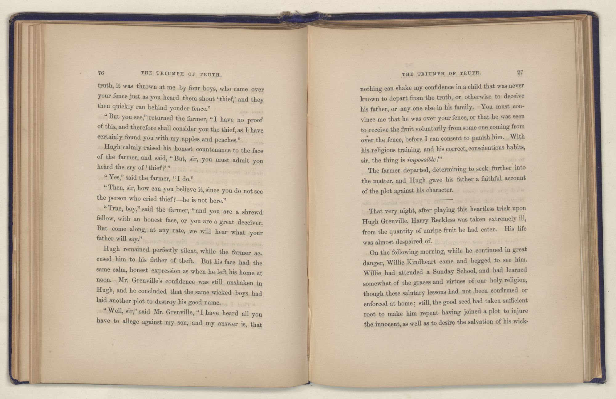 “Just as one would suppose,” said her aunt, “that as an infant is beautiful and sweetly amiable, as it grew, it would advance in those exquisite qualities, to the most delightful perfection; but, alas! how often is the reverse observed. I knew once a beautiful babe, almost the wonder of beholders, and yet, because not subjected to proper cultivation, its temper became sour and disagreeable, so much so as almost to deform its features. It was difficult to recognize it as the same beautiful child. Trained properly, this