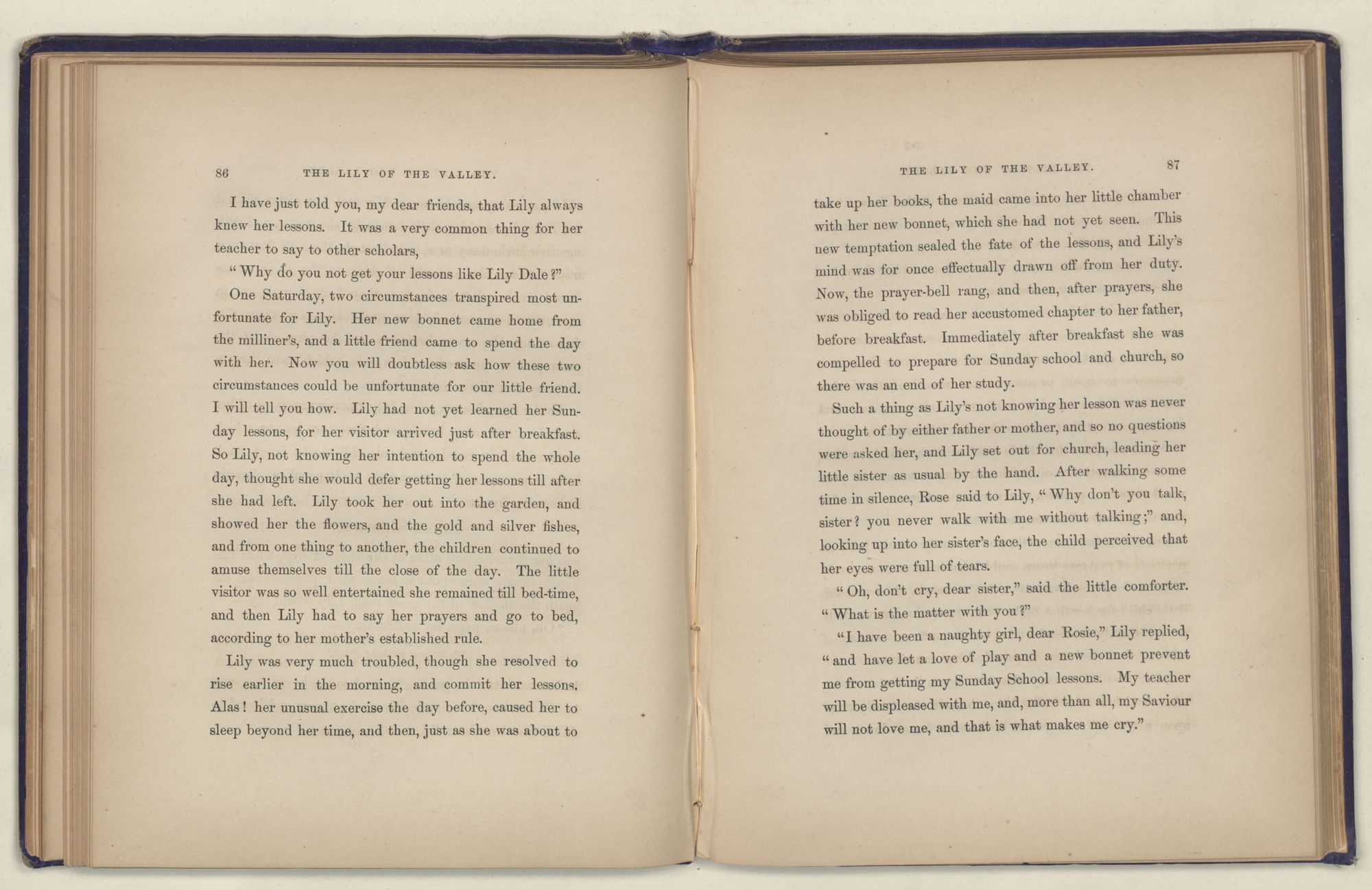 Little Bessie's thoughts seemed to be centred in one untiring effort to amuse and console her sightless parent. This good girl never rested till she had learned to read, that she might beguile and sweeten the lonely hours of her blind mother, by reading to her from the Bible, and other good books, which she had so much delighted in before she lost her sight. Morning, noon, and night found this young girl on her cricket at her mother's knee reading her chapter—and, oh, what a cordial it was to that mother's heart! In the morning, as soon as Bessie was dressed, she said her prayers, read her Bible to her mother, and then tripped out into a beautiful wood near by, and culled an apronful of flowers; and returning, placed them one by one in her hand, describing the beauties of each in her simple, child-like way, while she inhaled its rich perfume; prattling all the while of the bright blue sky, the soft sweet air, the music of the birds, and the beauty and fragrance of the woods, till her blind mother really seemed to enjoy them all, as much as Bessie herself.