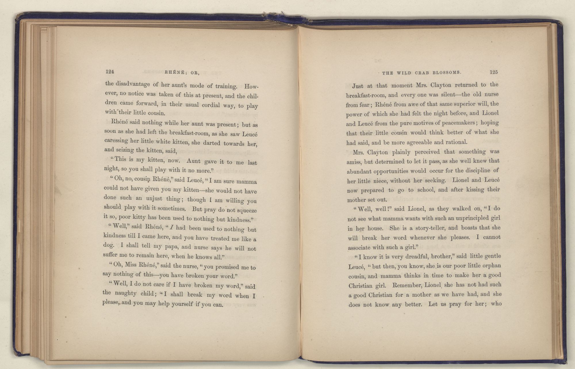 “Certainly not, my dear—and I am glad to hear you were not guilty of such unkindness and selfishness.” Just as Mrs. Clayton said this, and Rhéné was preparing to contradict her little cousin, Mary Clare came in, and confirmed all Leucé’s statement. The two little girls left the apartment, and Rhéné stood confounded and silent, though still swelling with passion. Her aunt now said to her—