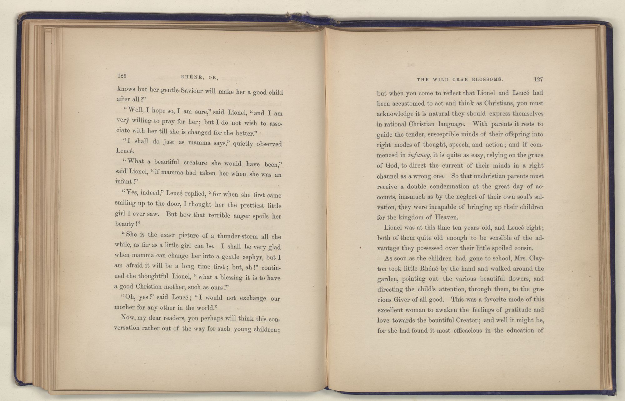 sweet countenance, and all will be over.” Mrs. Clayton turned up the little girl's face to hers by placing her hand under her chin, and the wicked spirit flew away, leaving an angel in his place. Away bounded Rhéné, the happiest child she had ever been in all her life, in this one moment.