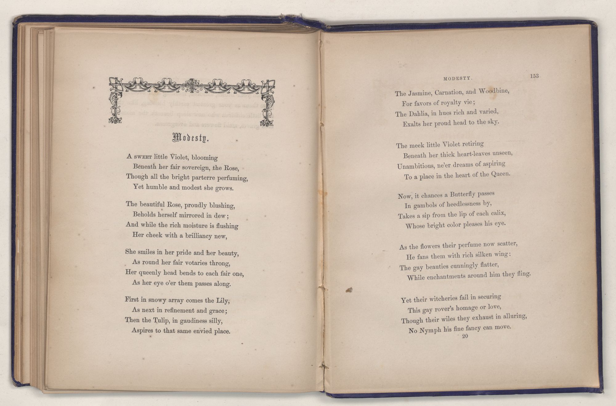 A sweet little Violet, bloomingBeneath her fair sovereign, the Rose,Though all the bright parterre perfuming,Yet humble and modest she grows.The beautiful Rose, proudly blushing,Beholds herself mirrored in dew;And while the rich moisture is flushingHer cheek with a brilliancy new,She smiles in her pride and her beauty,As round her fair votaries throng,Her queenly head bends to each fair one,As her eye o'er them passes along.First in snowy array comes the Lily,As next in refinement and grace;Then the Tulip, in gaudiness silly,Aspires to that same envied place.The Jasmine, Carnation, and Woodbine,For favors of royalty vie;The Dahlia, in hues rich and varied,Exalts her proud head to the sky.The meek little Violet retiringBeneath her thick heart-leaves unseen,Unambitious, ne'er dreams of aspiringTo a place in the heart of the Queen.Now, it chances a Butterfly passesIn gambols of heedlessness by,Takes a sip from the lip of each calix,Whose bright color pleases his eye.As the flowers their perfume now scatter,He fans them with rich silken wing:The gay beauties cunningly flatter,While enchantments around him they fling.Yet their witcheries fail in securingThis gay rover's homage or love,Though their wiles they exhaust in alluring,No Nymph his fine fancy can move.