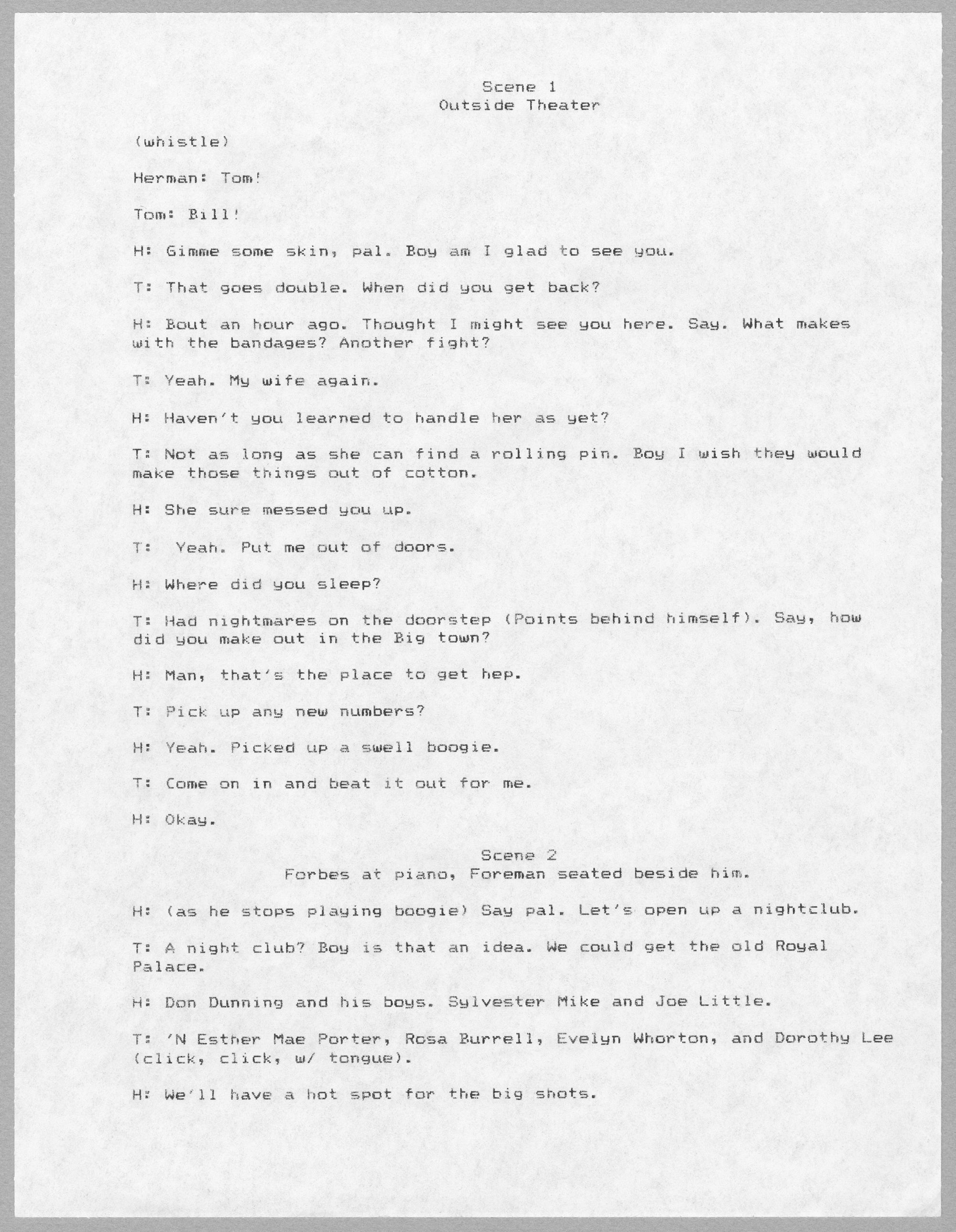 Typescript screenplay of the movie Pitch a Boogie Woogie. Title supplied by cataloger.