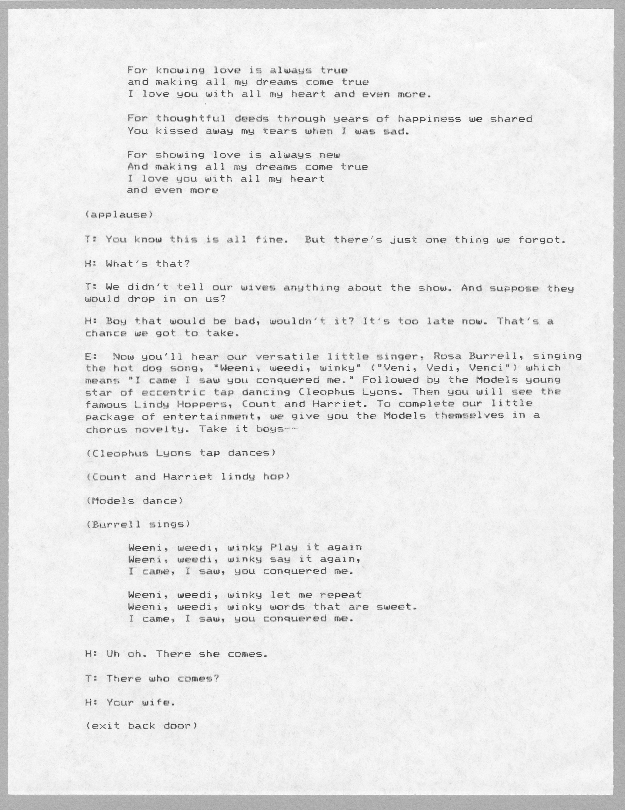 E: Now you'll hear our versatile little singer, Rosa Burrell, singing the hot dog song, "Weeni, weedi, winky ("Veni, Vedi, Venci") which means "I came I saw you conquered me." Followed by the Models young star of eccentric tap dancing Cleophus Lyons. Then you will see the famous Lindy Hoppers, Count and Harriet. To complete our little package of entertainment, we give you the Models themselves in a chorus novelty. Take it boys--