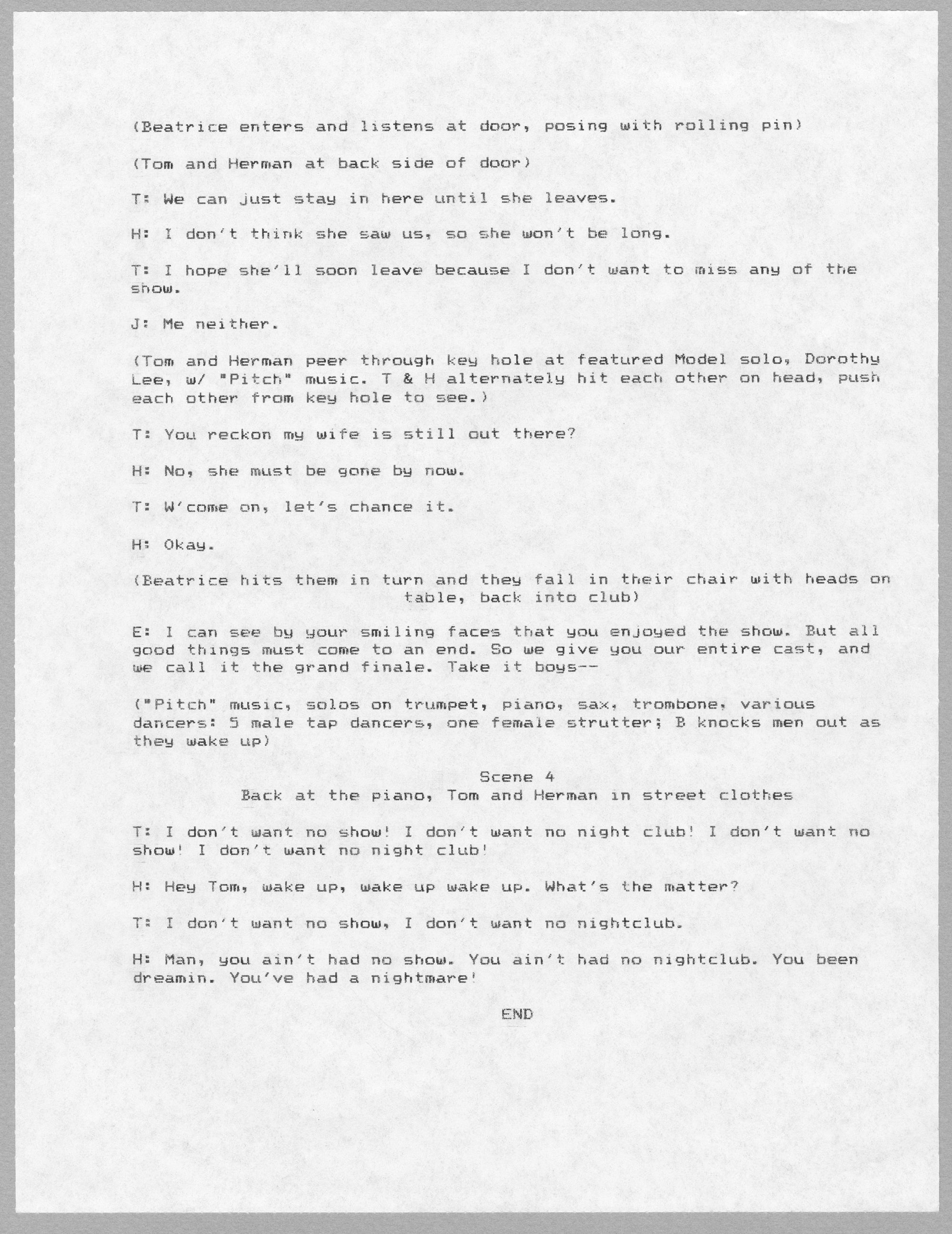 (Tom and Herman peer through key hole at featured Model solo, Dorothy Lee, WI "Pitch" music. T H alternately hit each otter on head, push each other from key hole to see.)