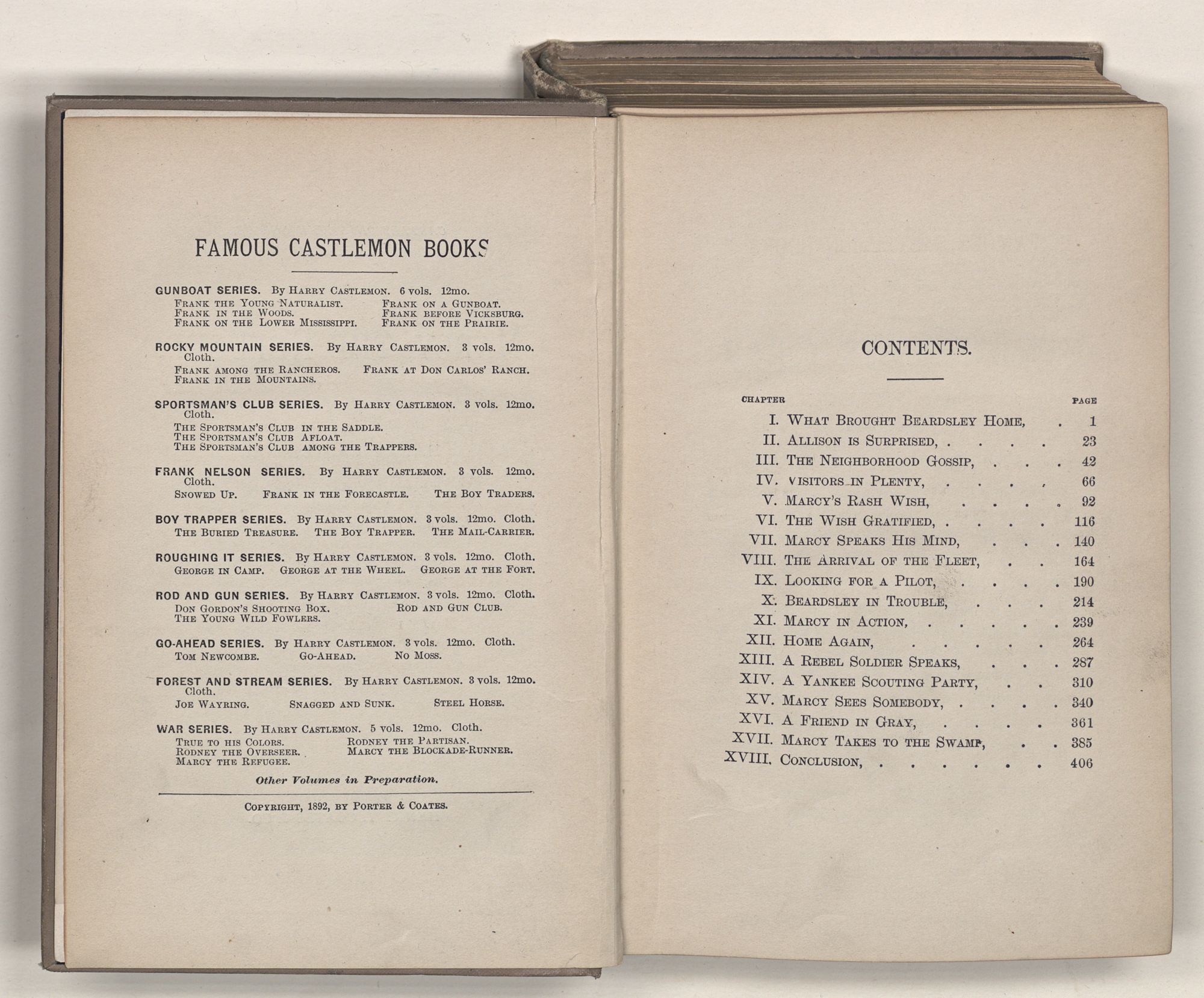 CHAPTER I. WHAT BROUGHT BEARDSLEY HOME.IN this story we take up once more the history of the exploits and adventures of our Union hero Marcy Gray, the North Carolina boy, who tried so hard and so unsuccessfully to be “True to his Colors.” Marcy, as we know, was loyal to the old flag but he had had few opportunities to prove it, until he took his brother, Sailor Jack, out to the Federal blockading fleet in his little schooner Fairy Belle, to give him a chance to enlist in the navy. That was by far the most dangerous undertaking in which Marcy had ever engaged, and at the time of which we write, he had not seen the beginning of the trouble it was destined to bring him. Not only was he liable to
